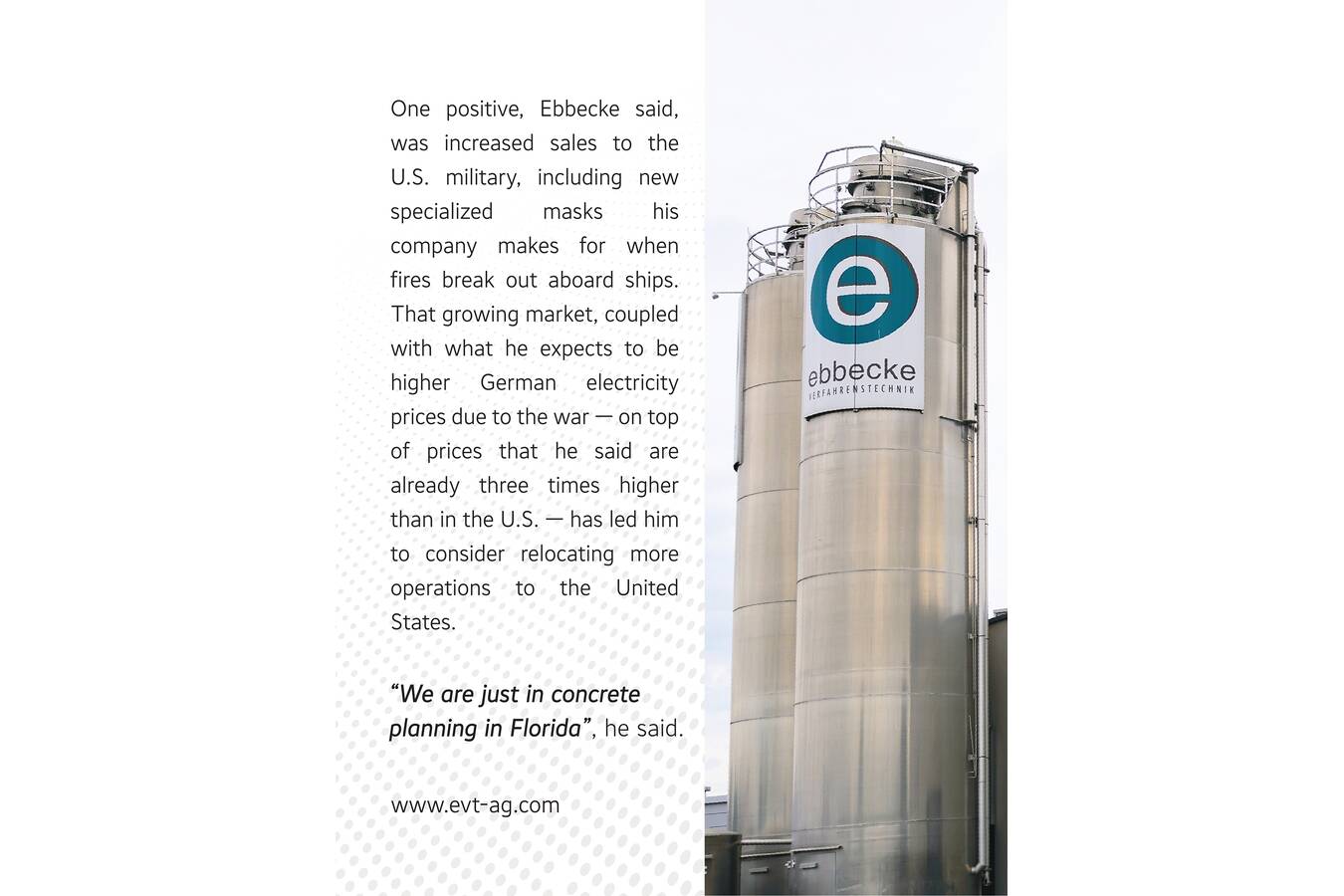 One positive, Ebbecke said, was increased sales to the U.S. military, including new specialized masks his company makes for when fires break out aboard ships. That growing market, coupled with what he expects to be higher German electricity prices due to the war — on top of prices that he said are already three times higher than in the U.S. — has led him to consider relocating more operations to the United States.