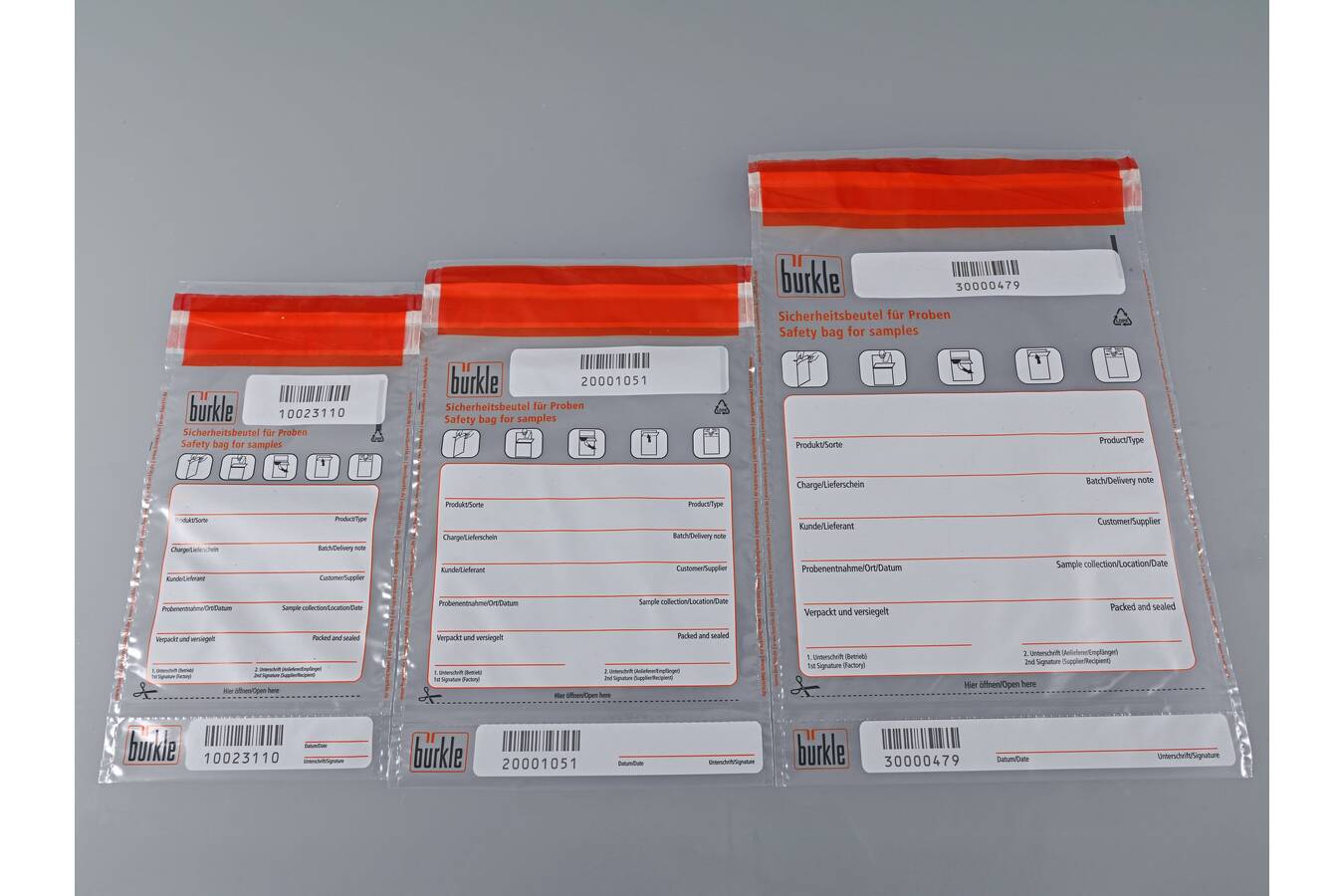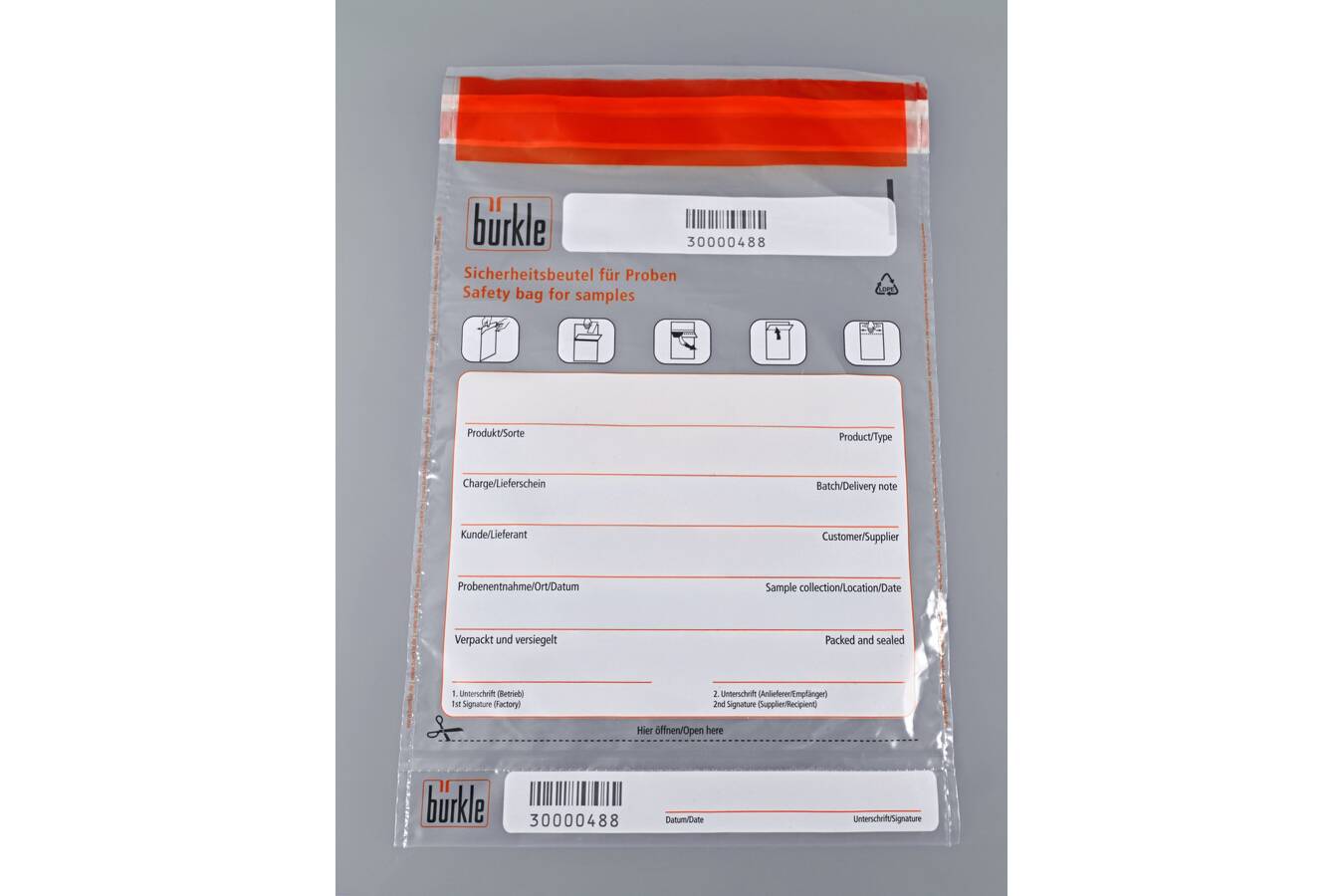 Bürkle bietet Sicherheitsbeutel für Proben an, die zu 80% aus recyceltem Material (PE-LD) bestehen. Die Beutel und das Abreißfeld sind mit einer achtstelligen, fortlaufenden Nummerierung versehen. Ausfüllfelder für Bezeichnung, Charge, Kunde, Ort, Datum und Unterschrift dienen der strukturierten und nachvollziehbaren Zuordnung der Probe. Ein unbefugtes Öffnen des Probenbeutels wird durch Void-Kennzeichnung am Sicherheitsverschluss sichtbar. Die Sicherheitsbeutel sind in drei Größen lieferbar (500 ml, 1000 ml, 2000 ml) - jeweils im Pack à 100 Stück.