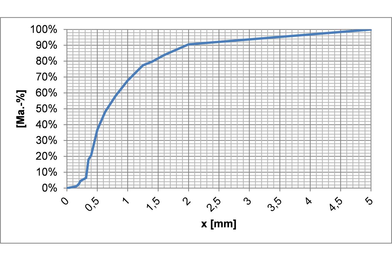 Die Partikelgrößenverteilung des Aufgabematerials ist in Abbildung 1 dargestellt. Die Schüttdichte des Aufgabematerials beträgt 0,88 kg/l. Der Schüttwinkel beträgt 35°. Der Feuchtigkeitsgehalt liegt bei weniger als 0,2% (m/m) H2O.
