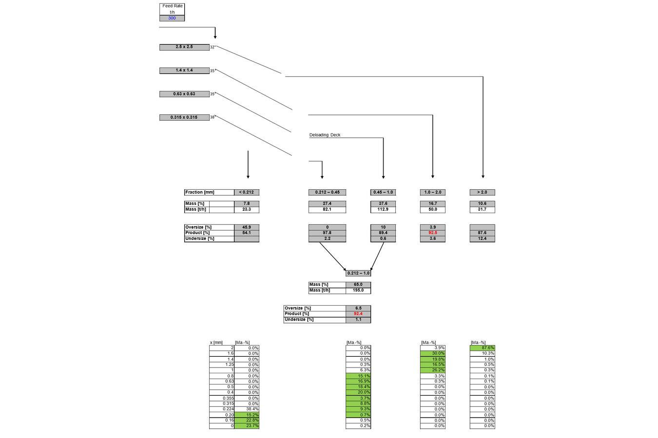 Die Ergebnisse des Labortests mit der RHEsono®-Siebmaschine sind in Abbildung 6 dargestellt. Ein sogenanntes Entlastungsdeck zwischen den Siebschnitten 0,212 mm und 1,0 mm hilft, die hohe Belastung auf dem untersten Deck zu verringern und somit die Siebeffizienz zu verbessern. Der relevante Prozessparameter war es, Produktreinheiten von mehr als 90% in den Produktfraktionen 0,212 – 1,0 mm und 1,0 – 2,0 mm zu erreichen, die sogar mit Produktreinheiten von 92,4% bzw. 92,5% übertroffen werden konnten.