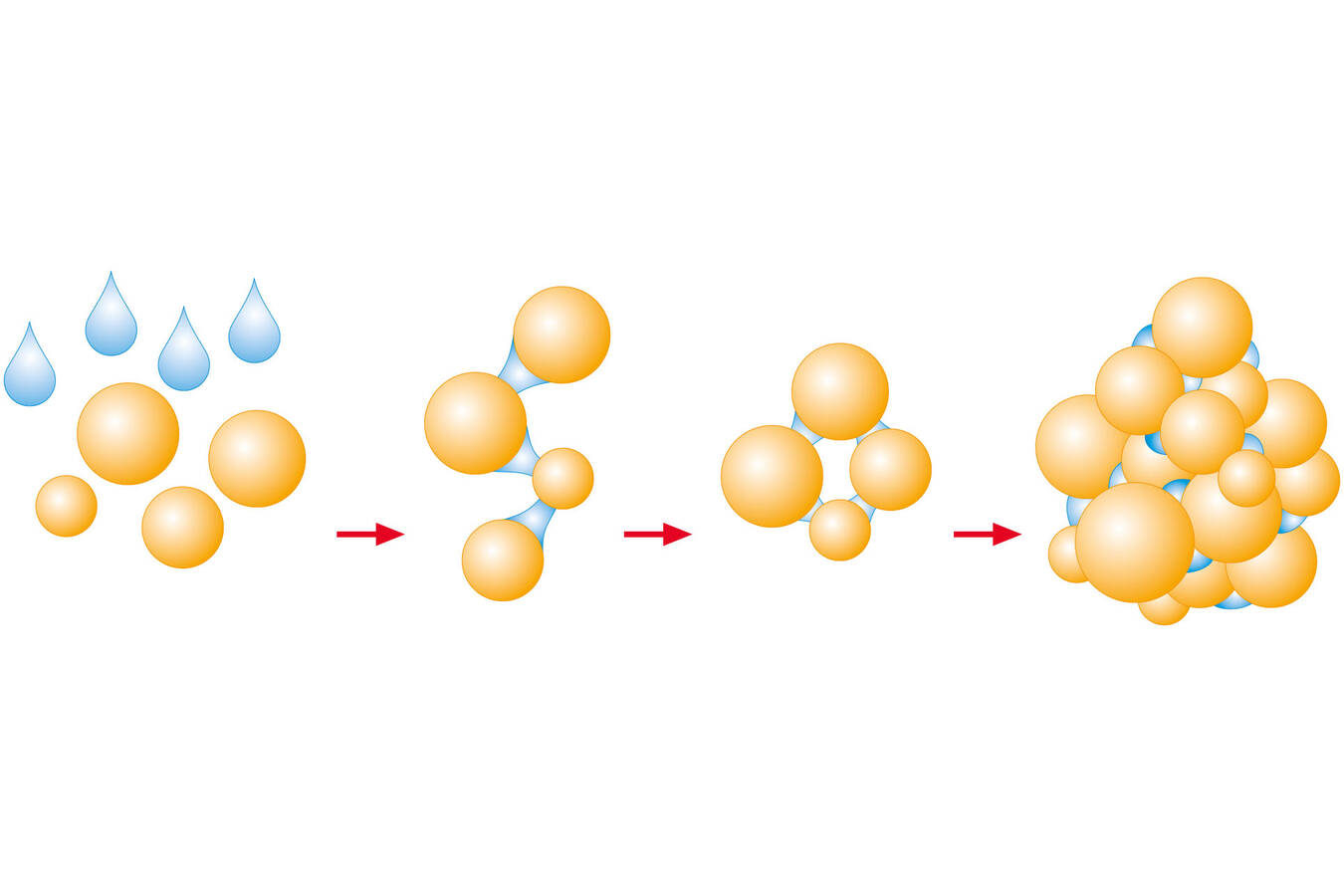 Agglomeration processes can be done both batch-wise and continuously. In fluid bed spray agglomeration, powdery or finely divided raw materials are moistened with an injected fluid. As a result, liquid bridges form between the particles (Fig. 2). Owing to the optimal heat and material properties experienced in fluidised beds, the moist agglomerates dry quickly and gently at a low fluidising gas volume flow rate and a low temperature. The typical product structure results from contacts forming between liquid-wetted particles (Fig. 3). Once they have reached a certain particle size, the products leave the fluid bed apparatus and can be packaged directly.