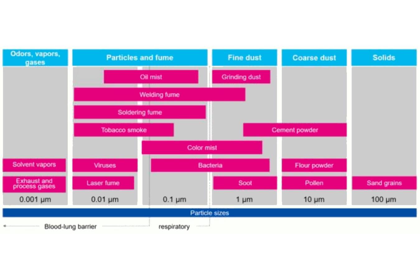 Size plays a crucial role in the evaluation of particulate matter. The spectrum ranges from coarse dust particles in the micrometer range to tiny nanoparticles produced by modern processes such as laser welding or nanomaterial processing. Especially nanoparticles pose a particular challenge because of their small size, allowing them to penetrate deep into the human body (lungs, brain).