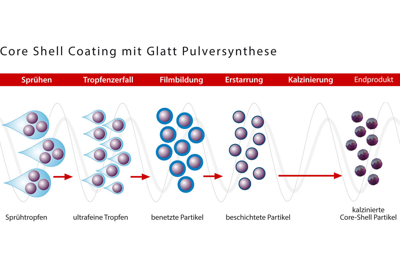Core-shell particles are obtained from suspensions using the Glatt powder synthesis process (Figure 1). The undissolved phase defines the particle size of the end product and forms the core material. The coating material is present in dissolved form and the ratio of solid to solution can be adjusted, which defines the layer thickness. The suspension is introduced into the pulsating gas flow of the powder synthesis apparatus: here, the controlled atomisation and subsequent secondary atomisation of the suspension ensure the production of very fine droplets. The solution wets the particle surfaces, which quickly dry because of the high heat and mass transfer rates. If necessary, the temperature can be increased further and combined with chemical conversion to produce the required end product quality.