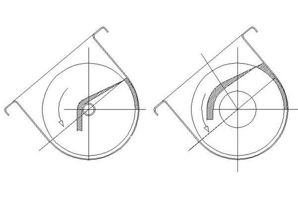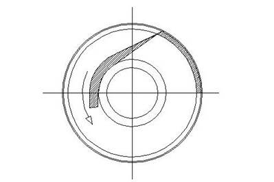 Moreover, when the axis of the conveyor is inclined, not only is the geometry of the screw affected, but the sliding angle of material on the flight surface is reduced. The inner region of a screw flight face has a much coarser inclination than at the tip of the flight and, combined with the ‘corner effect’ and drag of the centre shaft, can reduce below the inclination on the flight at which the material slips. Above the inclination at which this starts to occur an increasing amount of material will rotate with the screw and overspill the centre shaft.
