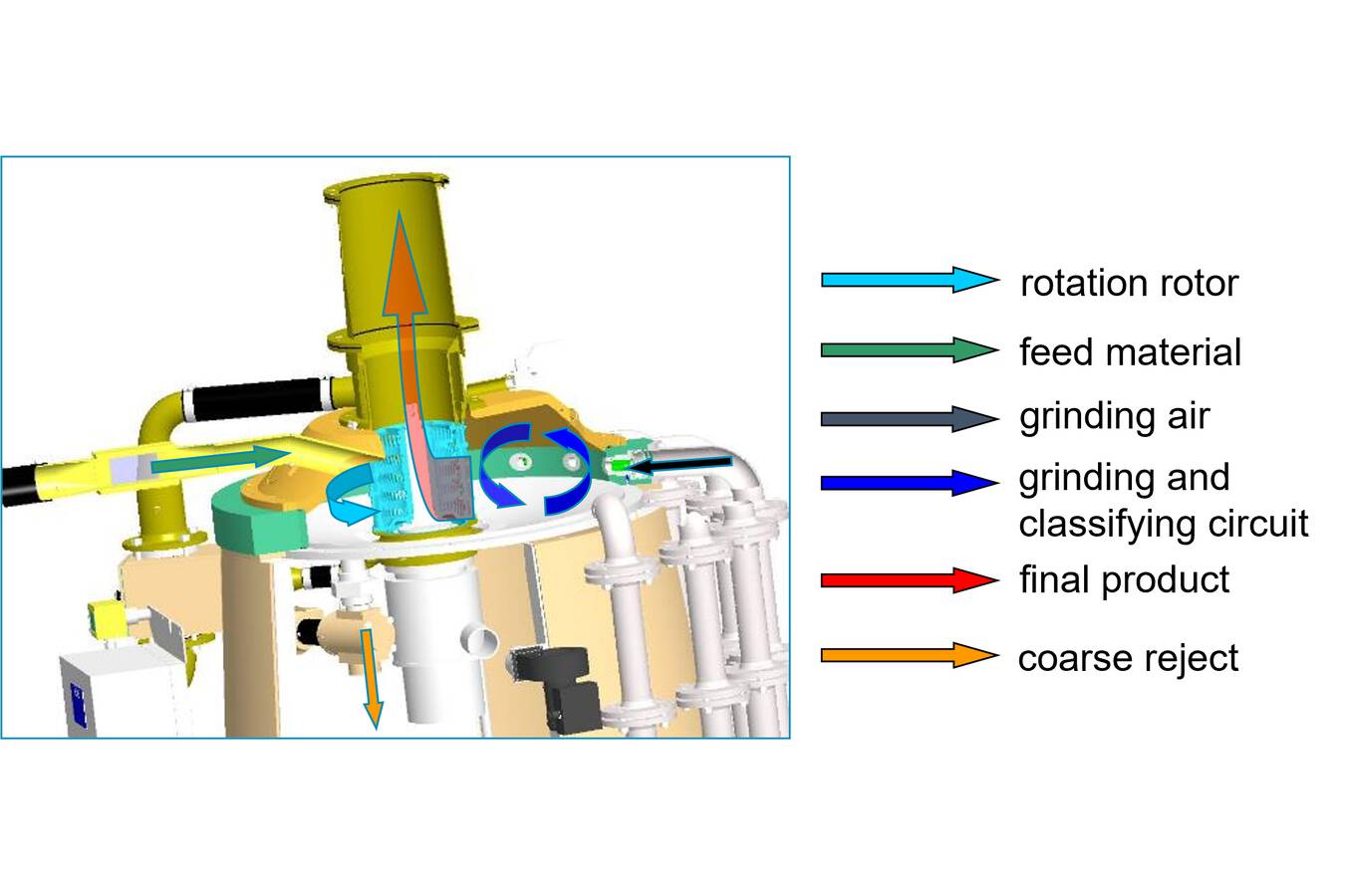 The functional principle of the PMT spiral jet mill is as simple as elegant. The material is fed pneumatically to the mill and runs spirally through the milling chamber. Grinding media enters the area through the milling nozzles. Grinding media is either compressed air (3.5 to 15 bar and 240°C) or superheated steam (up to 24 bar and 400°C). The air stream fluidizes the material-bed and lifts as much particles as possible into the stream. Comminution is mainly based on shearing forces which result from velocity differences. The integrated dynamic classifier is capable to run at a maximum circumferential speed of 190 m/s. As soon as the particles reach a certain finess, they can pass the classifier to the final product. The fineness can be easily adjusted by variation of the classifier speed.