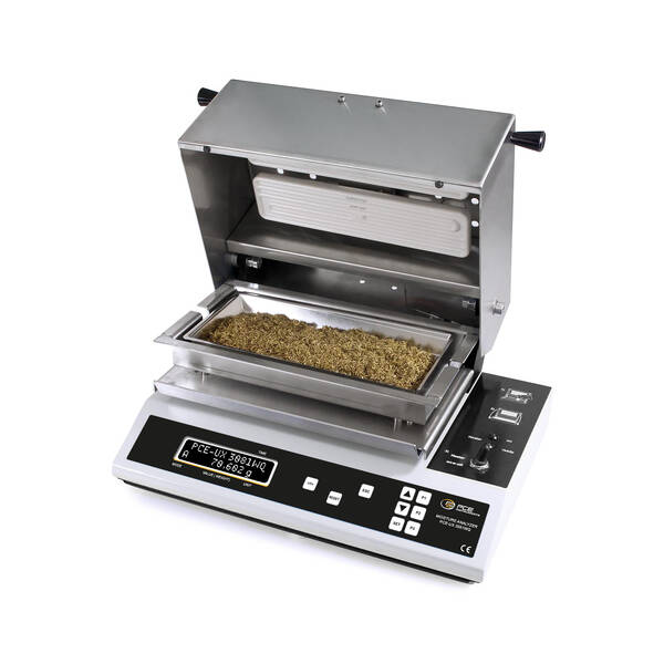 Moisture analyzers are indispensable for the exact determination of moisture content in the wood industry, agriculture and the plastics industry. Moisture analyzers are indispensable for the exact determination of moisture content in the wood industry, agriculture and the plastics industry. They are used in a wide range of applications in which the precise determination of the moisture content of materials plays a decisive role in optimising quality, shelf life and production processes. The new PCE-UX 3081 moisture analyzer from PCE Instruments is a special device for determining the moisture content of materials such as shavings, pellets, hay, tobacco leaves, tea leaves, granulates, powders and silage. The functional principle is drying with simultaneous weighing, the weight loss is displayed in %. In order to achieve reproducible results for light and bulky materials, the PCE-UX 3081 with its exceptionally large drying pan was designed for large weighing quantities. The moisture analyzer can be used to measure samples - e. g. wood chips - at up to approx. 200 °C. Weighing up to 400 g and 360 cm³ is possible.