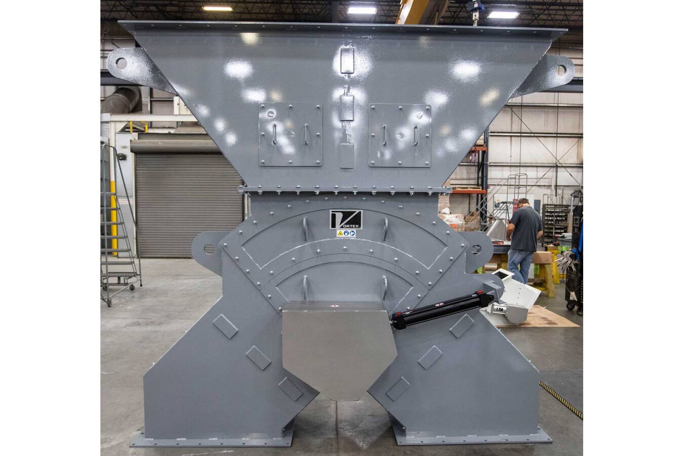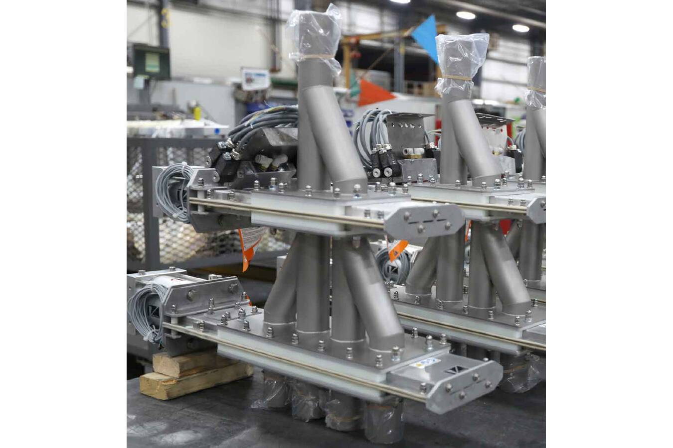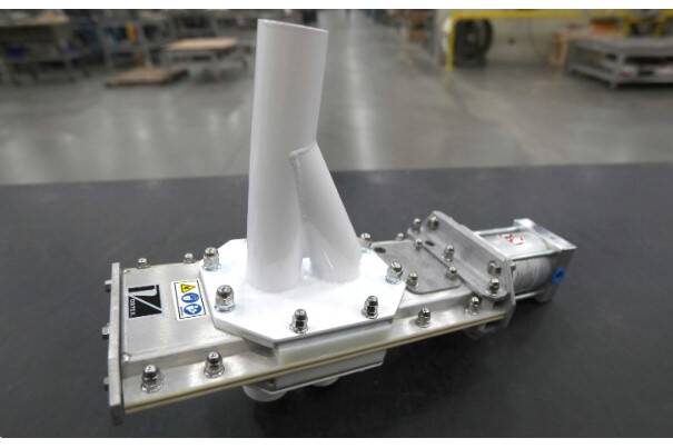 In this application, 50mm (2”) Vortex Wye Line Diverters are included on a factory piece of equipment that acts as a multi-tool machine used for building airplane parts. As holes are drilled to fasten sheet metal, the diverter is used as part of a vacuum system to pull away shavings. The shavings are routed through the straight leg to reduce wear and the off leg pulls to clean air. The straight leg is opposite the air cylinder to fit better in the client’s process. * These specific Wye Line Diverters feature Teflon pressure plates. * Aluminium valve body with live loaded, wear compensating seals with a 304 stainless steel blade. * Inlet and outlet weldments are constructed from carbon steel. Material contact is carbon steel, 304 stainless steel and polymer. * Inlet has a straight through conveying line design for easier ”in line” installation of multiple diverters. * PET pressure plates are backed with a foam void filler and live loaded natural rubber