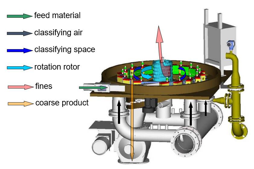 Classifying of finest powders at high recovery rate. Optimum dispersion because of positive pressure condition. PMT-Jetmill has developed the Jet-Classifier JS operating in positive pressure condition. Based on this special operation these classifiers have the finest range of products in high content recovery. This can also be achieved on an industrial scale. All types of powders Classifying means separation in a coarse and a fine fraction. Basically all types of powdery raw materials can be processed. Caused by strong agglomerates due to high surface forces, common classifying systems achieve only low classifying efficiency. The PMT Jet-classifier JS operates under positive pressure in order to optimize dispersion of the feed material based on high shear forces. The first positive pressure classifier for the submicron range leads to high content recovery even in the finest cut-point range. The use of the Rotor-Motor-Unit enables final product cut-points in the low micrometer and even submicron range. Benefits: * operation in positive pressure condition * improved