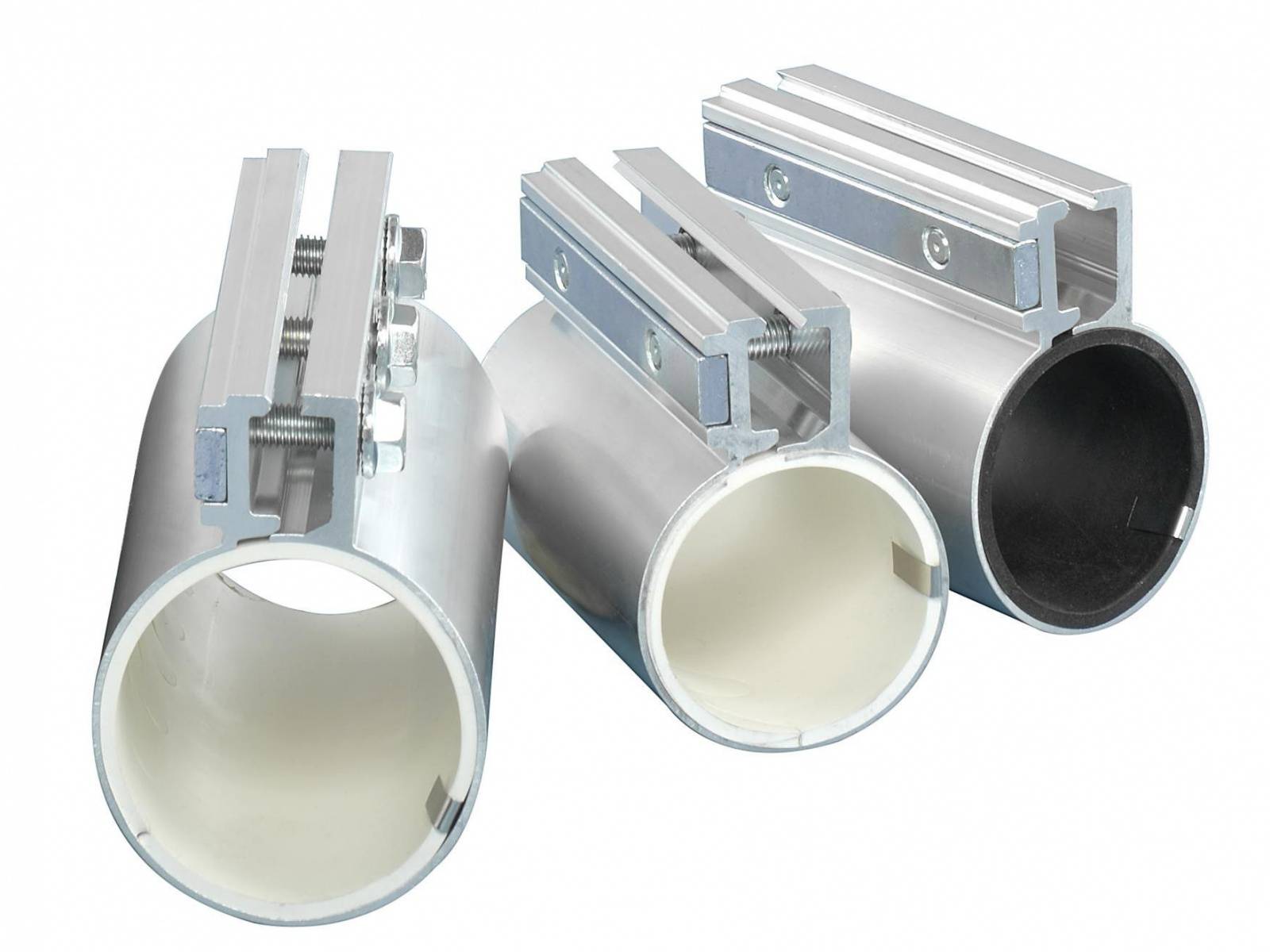 for suction conveying (light version) for outer pipe diameters from 33.7 mm to 110.0 mm, Version: DVK 6 - Quick closure, length 150 mm, Version: DVK 6 - Quick closure, length 100 mm, pipe coupling for connecting glass pipe bends with stainless steel pipes