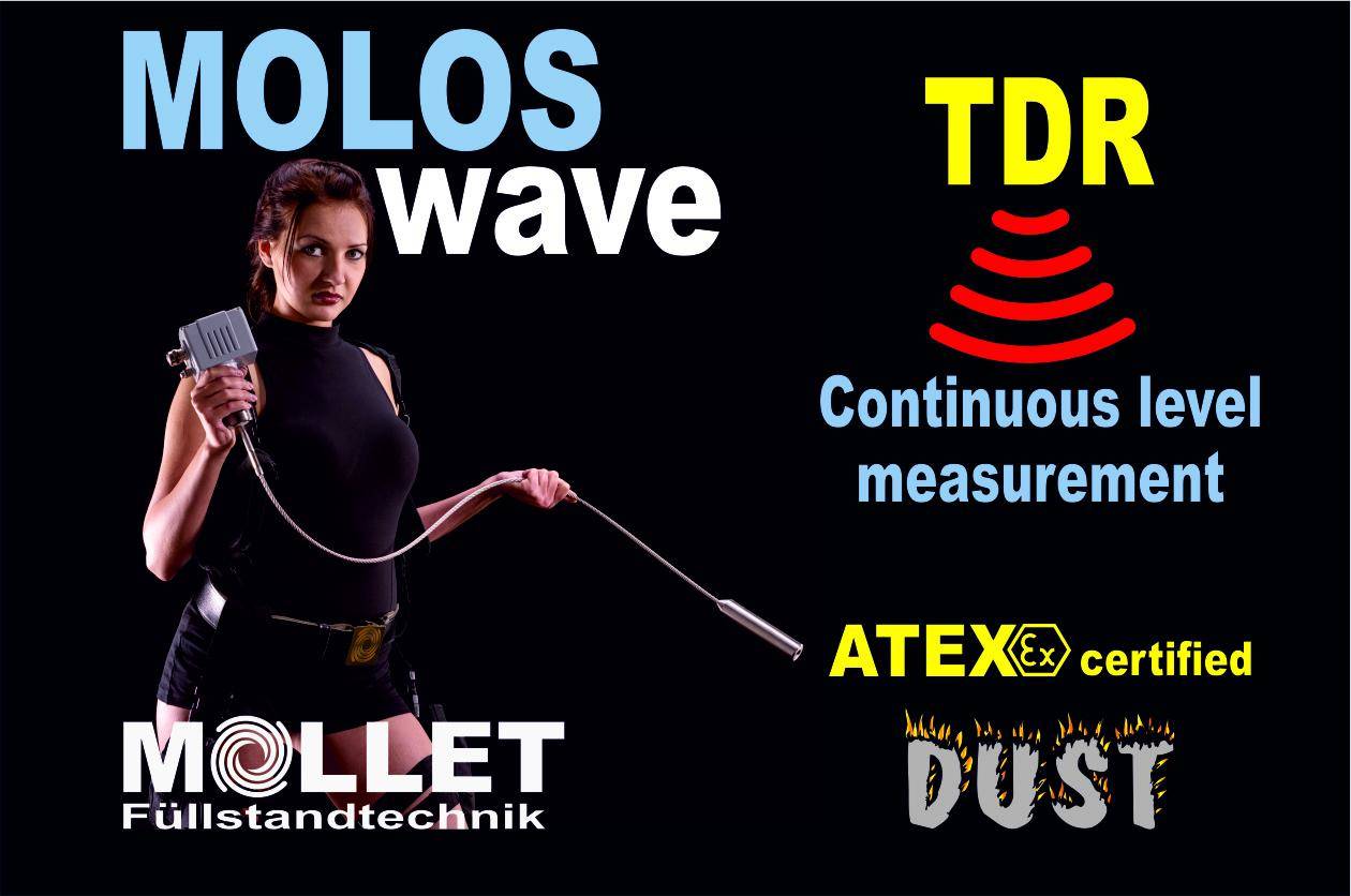 Level measurement devices of the MOLOSwave series also suitable for explosive bulk goods MOLLET Füllstandtechnik offers with the MOLOSwave series the opportunity, to measure the filling level in potentially explosive bulk goods as well. Reliable measuring signals and a very attractive price-performance-ratio make the MWF21 with rod probe and the MWF27 with rope probe extremely interesting for more and more customers worldwide. High accuracy due to four wire technology and independence of product characteristics as well as very good insensitiveness against dust, build up and condensate are further advantages of the MOLOSwave series. The radar measuring devices of the MOLOSwave series are based on the Time Domain Reflectometry (TDR) principle. In doing so high frequency microwave pulses with low energy are created that are coupled onto the probe and guided along this probe to the bulk goods. The product surface partly reflects these pulses. The electronic detects the reflected pulses and calculates the actual filling level from the time difference of the
