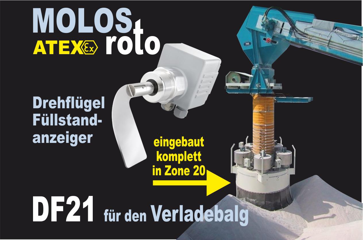 MOLOSroto rotary paddle level indicators approved for zone 20 offer new opportunities There are principally two kinds of loading bellows. Beside the loading bellows for closed loading of dusty bulk solids into trucks or wagons with filling holes there are systems for the open loading of bulk solids onto trucks, wagons, ships or heaps. During the open loading of potentially explosive bulk solids it could happen, that the complete MOLOSroto sensor is located in zone 20. One example are large loading systems for ships with a loading capacity of 2.000 m3/h and a height difference up to 50 m. In this loading bellows three MOLOSroto level indicators are required for the control of the discharge header and they are mounted completely in zone 20. The rotary paddle level indicator MOLOSroto DF21 approved for zone 20 offers the designers of loading systems new opportunities. With this approval the complete sensor including control unit can be mounted in potentially explosive atmospheres of zone 20.