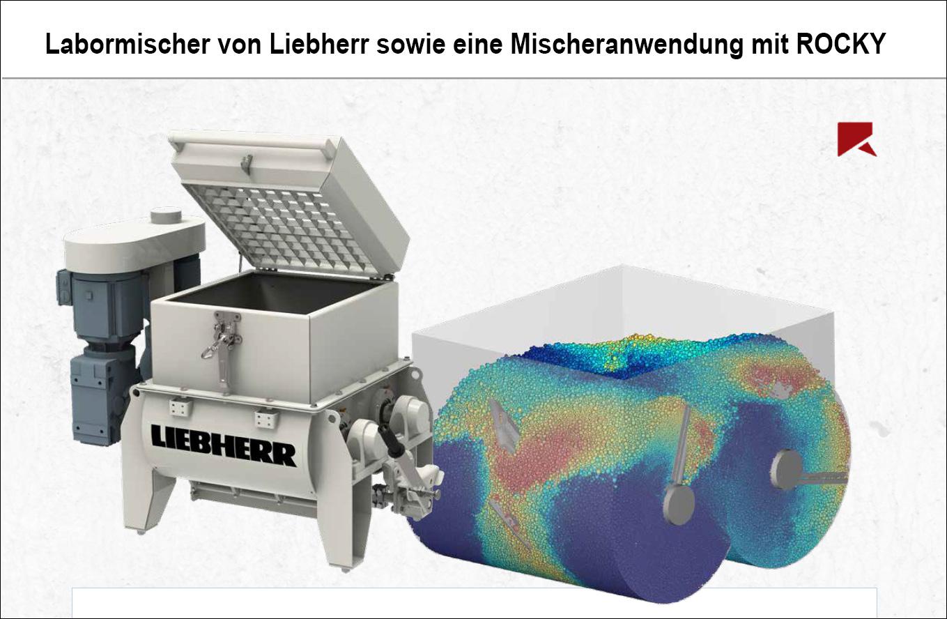 The optimization of mixing processes with the simulation software Rocky dem Traditionally, the quality assessment of mixing processes in many companies is still based on time-consuming test series, which, especially in batch processes, provide insufficient data on the time course and the overall spatial distribution of the mixing quality. Liebherr Mischtechnik reports in our Cadfem journal article (see link on the right) how the use of particle simulation with ROCKY-DEM helps to optimise process parameters - to improve energy efficiency and compound quality as well as to save costs. With ROCKY-DEM, input parameters such as particle sizes and size ratios as well as the speed and residence time of the product could be varied quickly. An evaluation of the mixing quality was now possible over the entire mixing trough and at any time. Statements about required torques and optimum speeds can also be made in this way. In addition, statements on new developments or design changes can be made by means of simulation without the need for cost-intensive