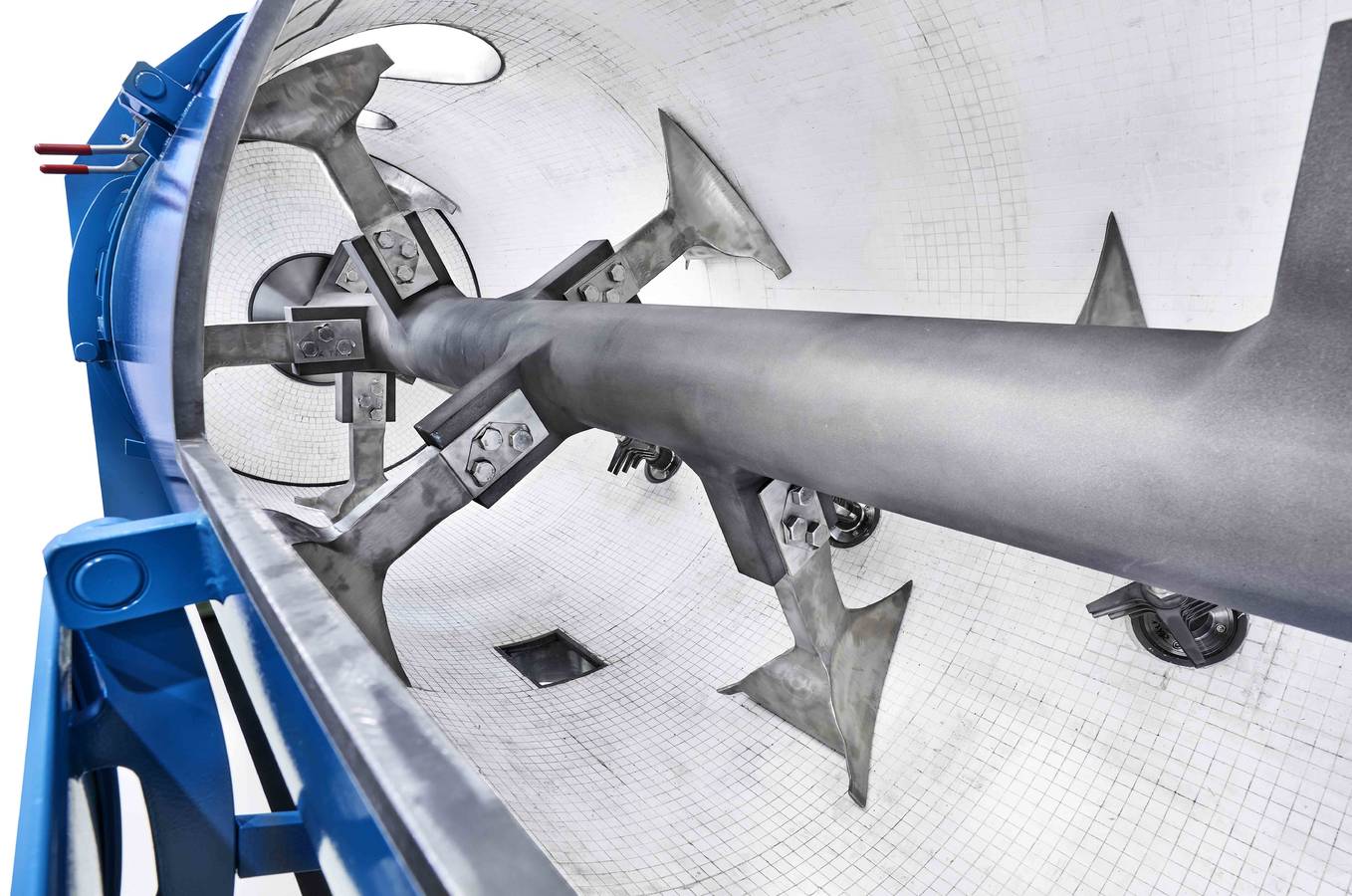 Sophisticated in every detail In the production of lithium batteries extremely high quality demands are placed on the preparation of the required raw materials – even to the limits of technical feasibility. For example, the contamination of cathode masses by foreign ions – in particular iron – must be avoided at all costs. Lödige has addressed this challenging process-technical task with a special version of the proven Ploughshare® mixer. The mixing drum has a ceramic lining, but due to their more complex geometry a different covering was required for the mixing elements. Together with the mixer shaft and choppers, they were provided with a thin, but extremely tough ceramic coating. The coatings can be adjusted to the respective application. Standard coating materials are based on aluminium oxide or tungsten carbide. In any event, these wear-resistant, hard coatings are designed for long-term operation. Because the battery masses contain toxic and carcinogenic components such as cobalt,
