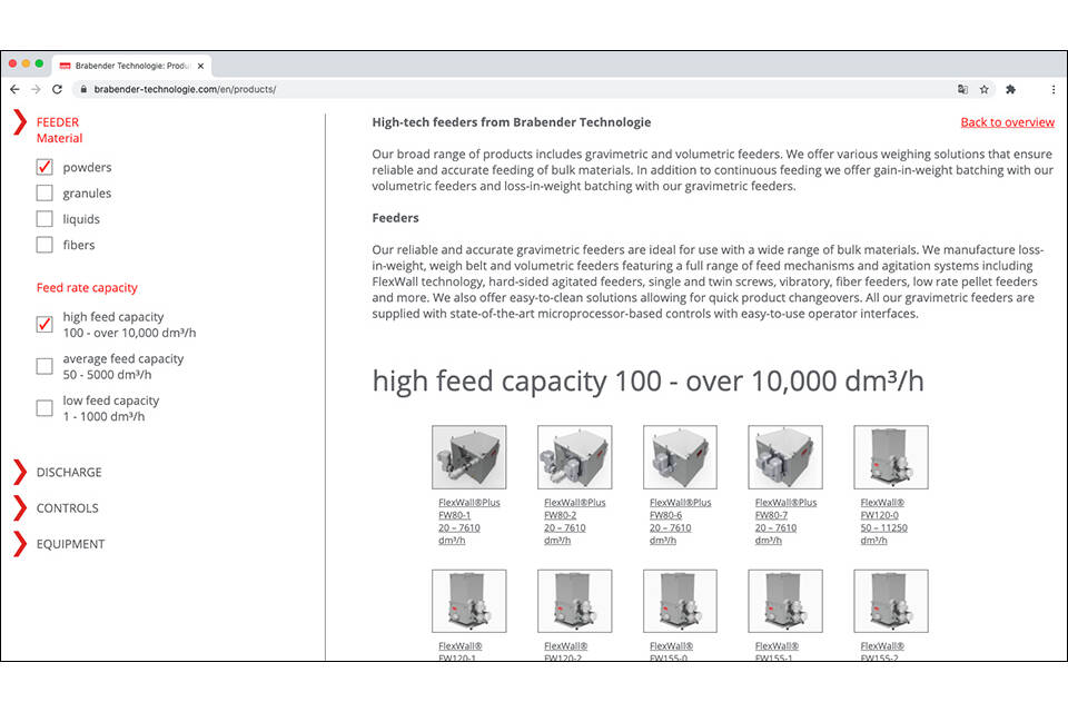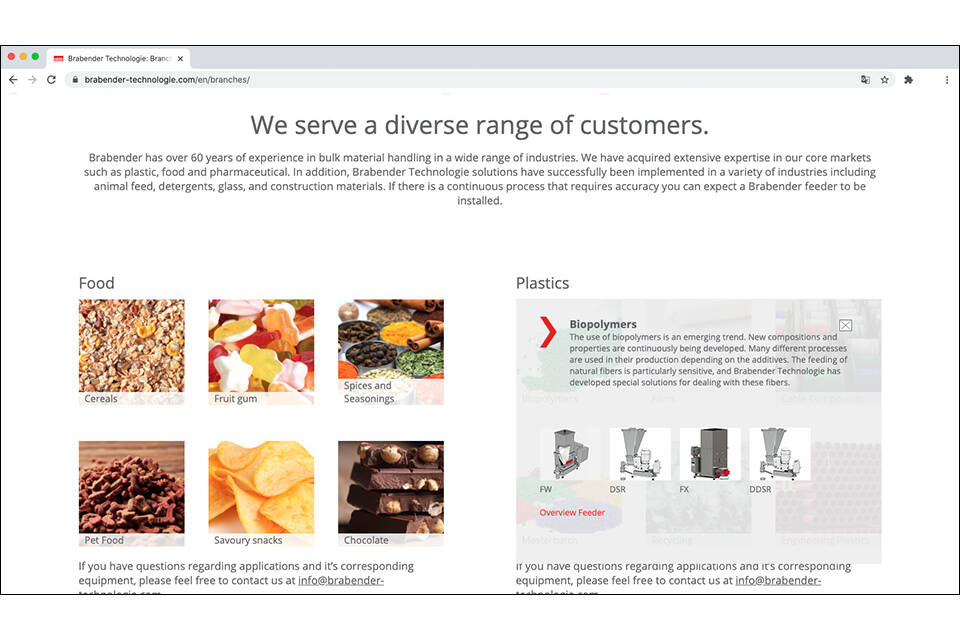 The renewed corporate website of Brabender Technologie now focuses even more on the application. A good example of this is the subdivision of more than 20 industries, in which the possibilities of Brabender Technologie are shown. User filters help you quickly find the right dosing solution.