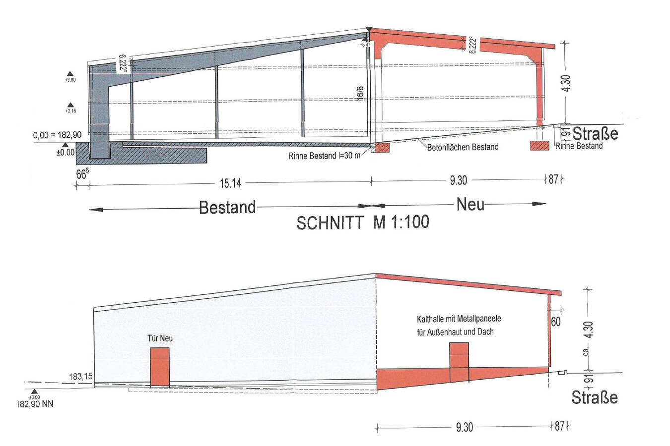 For this purpose, the previously open hangar was extended to the street as shown in the attached view. In this context, the hall will be completely refurbished with sandwich panels to enable frost-free storage of up to 1,000 pallets.