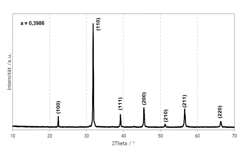 Barium strontium cobalt iron oxide (BSCF) — Ba0,5Sr0,5Co0,8Fe0,2O3-δ — is a complex compound with a perovskite-like structure and is used as an ion conductor for oxygen membranes and as an electrocatalyst for hydrogen production [1,2]. Its use in fuel cells is also the subject of current research, but is often hampered by chemical instability. It has already been shown that by varying the iron/cobalt ratio, it is possible to adjust BSCF’s thermal resistance at low oxygen partial pressures [3] and increase its resistance to CO2 by decreasing the barium content [4]. As such, this demonstrates the potential to modify the property profile of complex materials to meet the needs of a particular application.