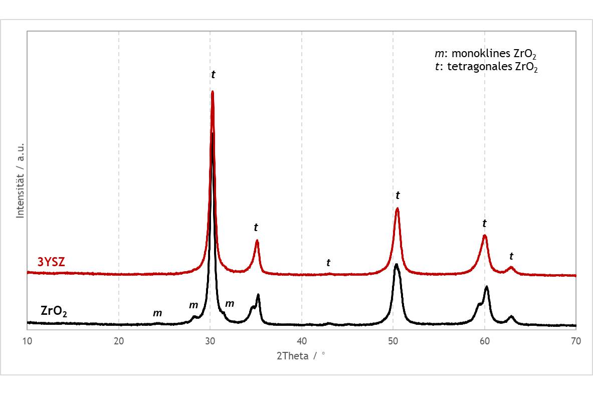 The second example that will be discussed in more detail is zirconium dioxide (ZrO2). It’s used for the large-scale production of thermal insulation layers, medical applications and commodity products such as kitchen knives. The material occurs in different crystalline structures; at room temperature and normal pressure, pure ZrO2 exists in a monoclinic phase. With increasing temperature, this changes to a tetragonal structure (1170 °C) and, from approx. 2370 °C, into a cubic crystal structure [5,6]. Owing to this phase transformation and the associated change in volume, it is not possible to manufacture components from pure zirconium dioxide.