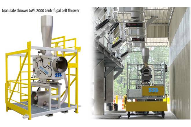 Granulate thrower GWS 2000: Filling tests of a 53’ container for USA We set up and simulated a test with our granulate thrower in our halls for a customer from the USA.