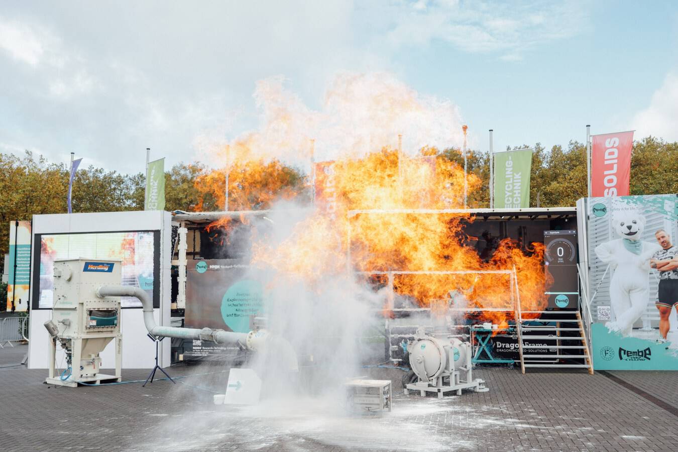 The lecture panels were equally impressive. Here, high-calibre speakers provided momentum for the future of the bulk solids and recycling industry. This was also confirmed by Andreas Kuß, Project Manager Plant Construction and Environmental Protection, EGN Entsorgungsgesellschaft Niederrhein mbH ‘My visit to the trade fair was very successful. A day full of excellent discussions and very informative expert presentations’. For example, AI expert Christiane Reichwein gave an introduction to the possibilities of artificial intelligence and Jan Eilers, Senior Project Manager at Horváth & Partner GmbH, together with Principal Dr Markus Stoffel, showed how products and their entire life cycle can be designed sustainably. Several live explosions on the trade fair forecourt with professional cyclist Robert Förstemann and REMBE® GmbH Safety+Control also enriched the supporting programme.