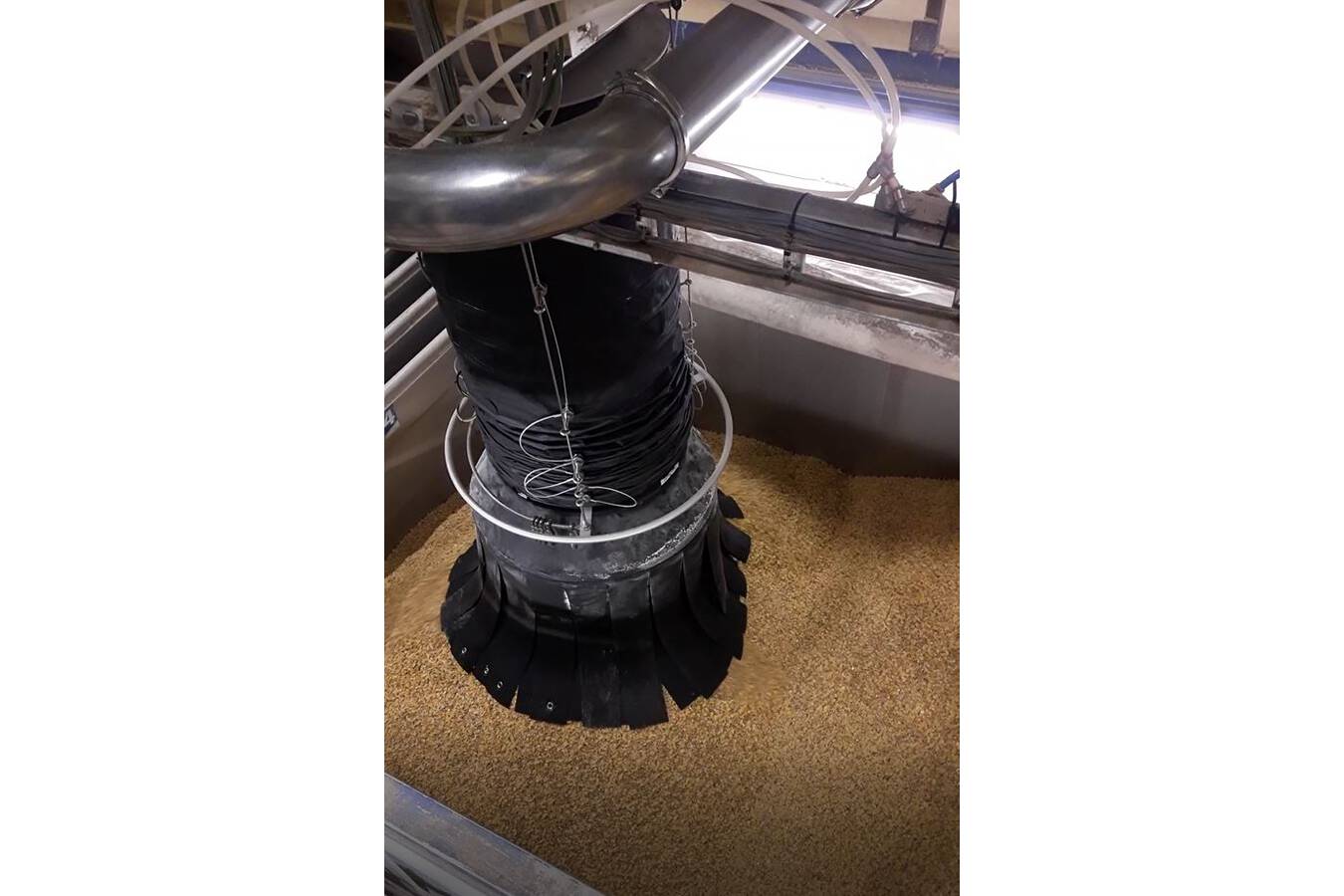 An example of closure is the deployment of a dust skirt under the spout. An automatic height adjustment ensures that the skirt rests on the product surface. A well-designed dust skirt is very effective, especially when moving vertically. Horizontal movements should be limited as much as possible or done in small increments, to keep the connection to the product surface intact. In practice, this is where things sometimes go wrong. A dust extraction has an effect, but this is completely lost if the seal is not good enough.