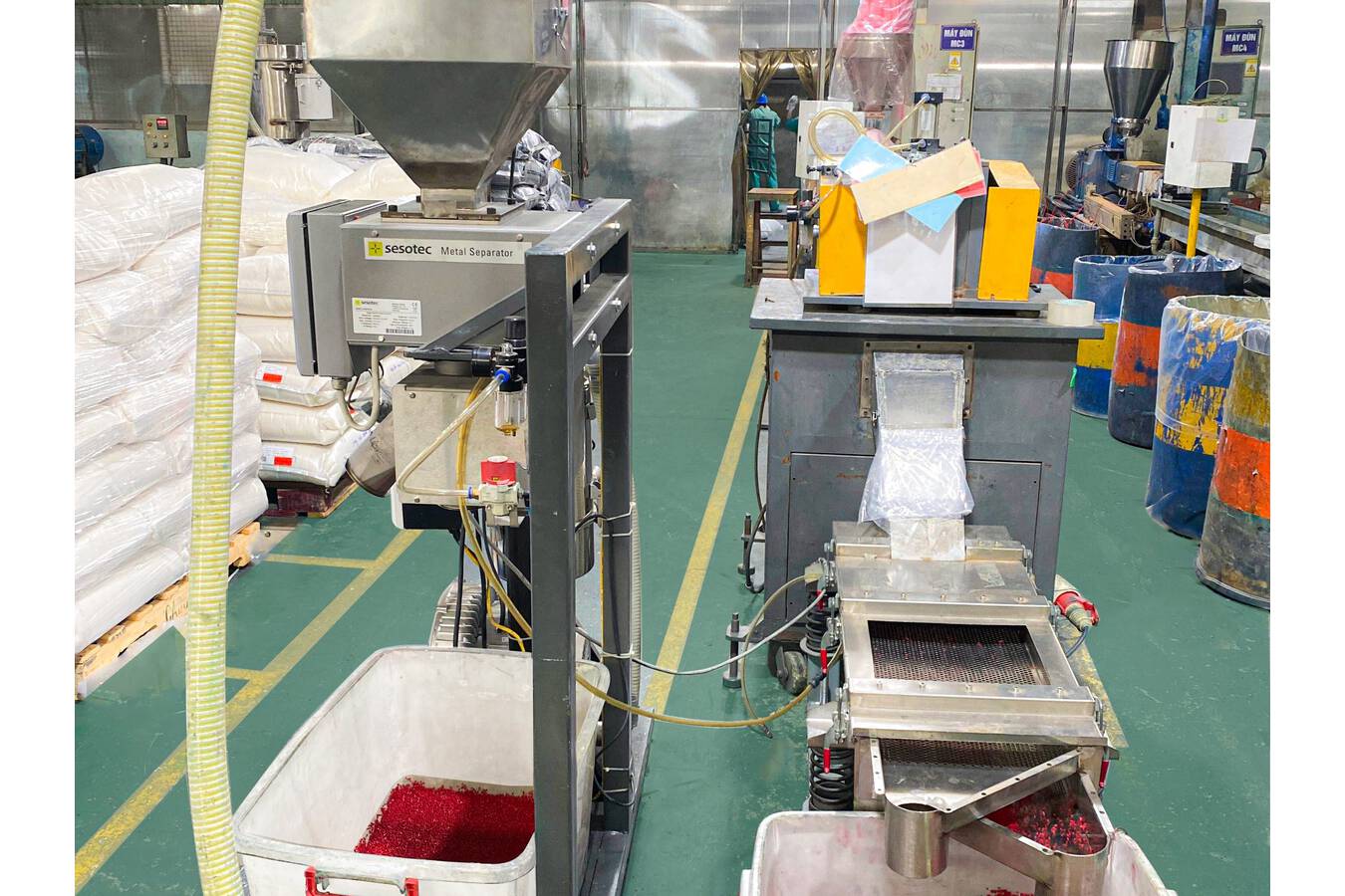 Viet UC faced the challenge of removing metallic impurities in the masterbatch* to prevent particles from entering the plastic mixtures during production. These impurities could not only affect the quality of the end product, but also lead to machine downtime and customer complaints. To ensure the quality and purity of their products, it was necessary to find a reliable metal separator that was sensitive enough to detect and remove even the smallest metallic particles (ferrous 0.39 mm, non-ferrous 0.5 mm, stainless steel 0.5 mm). They also had to ensure that the solution would work effectively even with challenging product effects such as dark colors, especially with black masterbatch.
