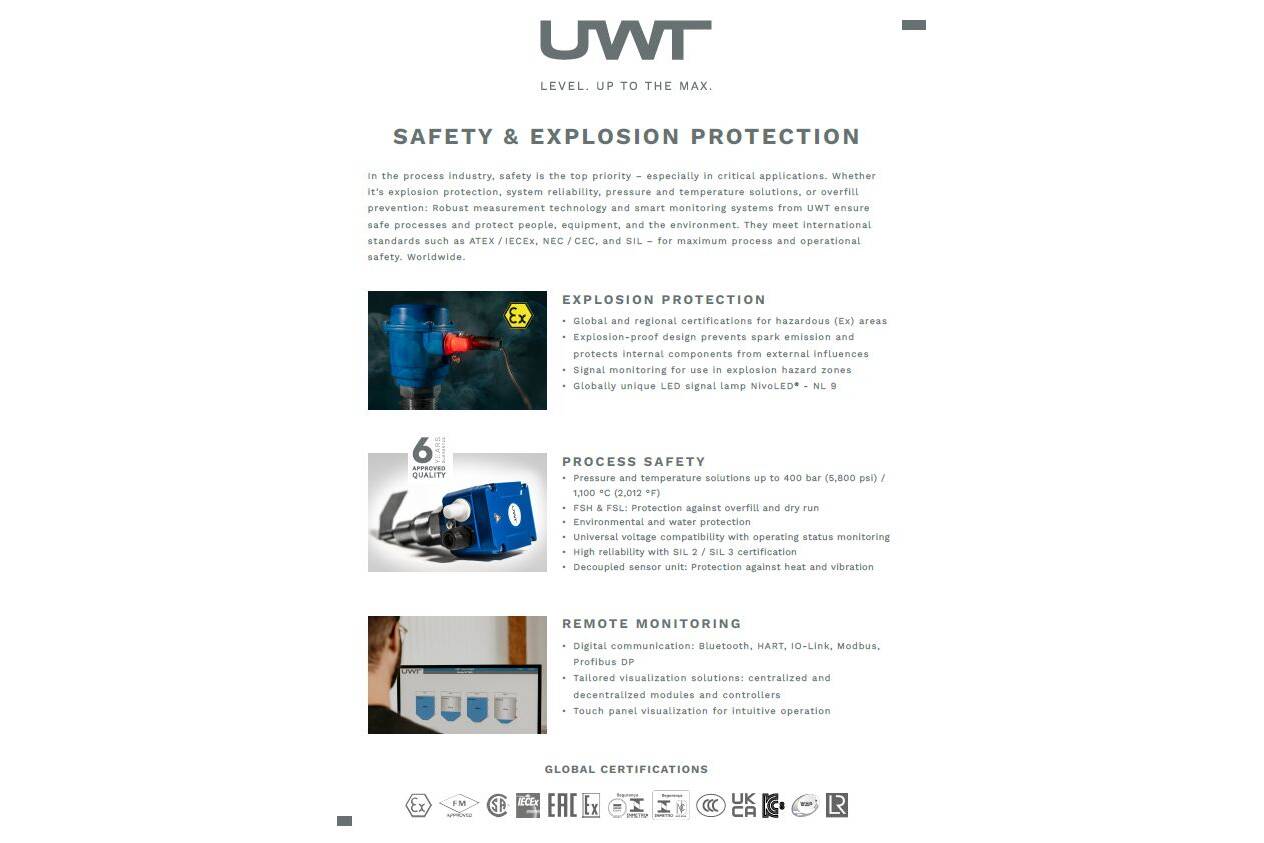 Level sensors and intelligent monitoring systems from UWT provide exactly the level of protection needed for sensitive applications — globally and certified according to international standards such as ATEX / IECEx, NEC / CEC, overfill prevention, or SIL.