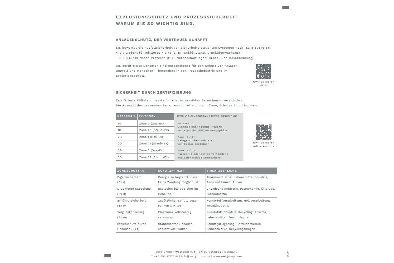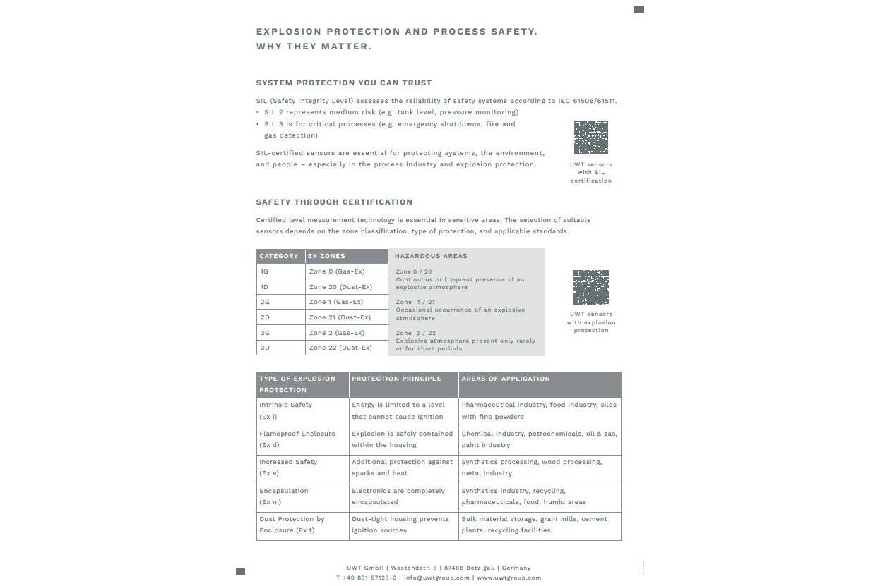 For each of these zones, UWT offers tailored level measurement solutions – featuring intrinsically safe electronics, flameproof enclosures, encapsulated components, or dust-tight housings. Our sensors are designed to eliminate any potential ignition source and ensure reliable protection of the device interior against external influences.