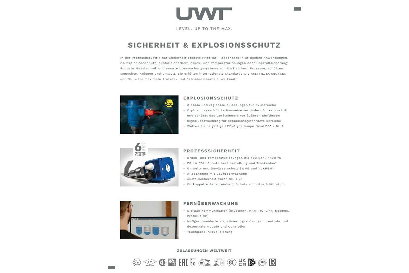 UWT GmbH is one of the world’s leading manufacturers of measurement technology for the detection and monitoring of levels, limit levels in any kind of bulk materials, solids as well as in liquids, pastes and foam. Since the founding, the product portfolio has developed and offers solutions for a variety of industries. > Headquarter with development, production and sales department in Germany > Subsidiaries in USA, China, India, Mexico, Brazil, Great Britain, Spain and Poland plus a global net of exclusiv distributors > Several million applications have now been deployed in more than 90 countries > Variety of industry solutions according to individual requirements > UWT products represent quality, flexibility and reliability Our products are named under: Rotonivo® - Rotary paddle switch incl. SIL2 version Vibranivo® - Vibrating fork for bulk and liquid Mononivo® - Vibrating rod probe RFnivo® - Capacitive level switch also with anti-corrosive Teflon® coating for flue gas cleaning Capanivo® / NivoCapa® - Capacitive level switch NivoBob® - Electro-mechanical Plumb Bob as well for Interface NivoRadar® - Radar sensors NivoGuide® - TDR guided radar NivoTec® - Level monitoring and visualisation NivoLED® - Signal Lamp – Maximum Safety for Hazardous Areas From development and production to final assembly and comprehensive technical advice, all services are provided from a single source. The focus is on the highest quality, technical know-how and good cooperation with customers, suppliers and partners. What is particularly important to the managing directors Uwe Niekrawietz, Markus Schalk and Andreas Haug is the well-being of the 200 employees worldwide: ”Healthy and happy employees can achieve incredible things”.  The product portfolio is developed further every year and enables holistic solution concepts for a variety of industries. In addition to level and point level measurement, UWT offers monitoring and visualisation systems and complete project planning. Well-known plant manufacturers and end customers worldwide appreciate the customised solutions as well as the easy handling and durability of UWT sensors. In order to be able to pass on the best possible added value to customers in the future, UWT’s corporate strategy is consistently geared towards steady and sustainable growth.