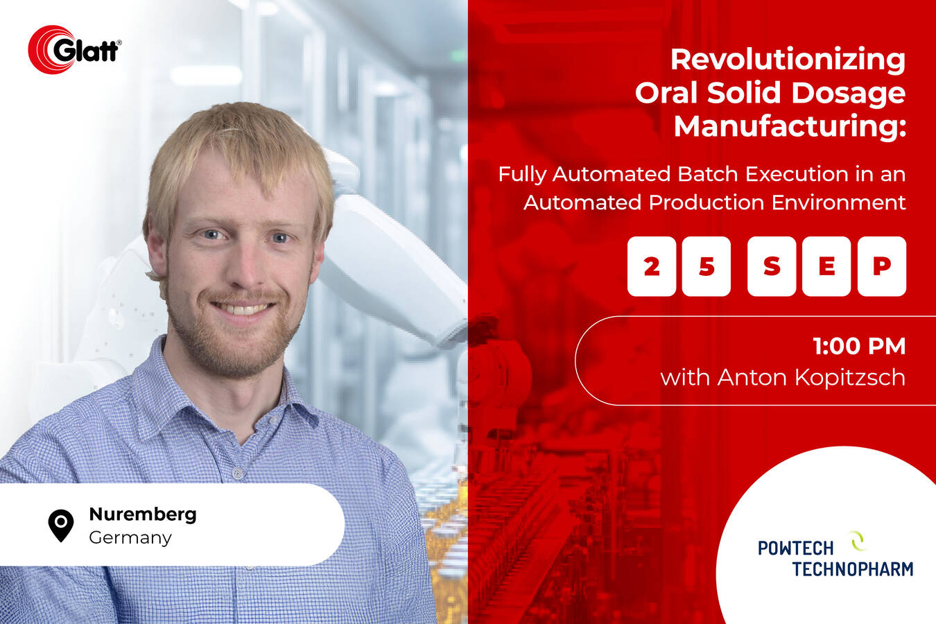 Anton Kopitzsch, Team Lead Automation Engineering, Process & Plant Engineering, will devote his session to revolutionising the manufacture of solid oral dosage forms and outline fully automated batch execution in an advanced automation environment (25 September, 13:00, Stand 10-356). Glatt and Bayer’s innovative approach integrates advanced intralogistics, tracking technology and data acquisition into a sophisticated automation system, enabling seamless operations, unmatched efficiency and best-of-class quality control.