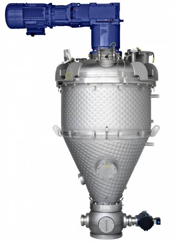 Polymerisation, metal coating and crystallisation are just a few examples of high-temperature processes. Hosokawa Micron has responded to market demand for these kinds of processes by developing various processing equipment including the conical paddle mixer (CPM) and the conical paddle dryer (CPD). Just like the Vrieco-Nauta mixers, all these pieces of equipment have a wide range of uses and the product can be discharged quickly, efficiently and completely. However, what makes the CPM and CPD different from the conventional Vrieco-Nauta mixer is that they only have one drive unit. This reduces the construction complexity of the high-temperature systems. As a result, models are available with useful volumes of up to 10,000 litres for product temperatures of up to 325°C. Apart from the double-walled versions, the CPM and CPD can be adapted for specific applications, irrespective of whether atmospheric, overpressure or vacuum processes are required. Construction materials, bearings, gaskets and seals can be aligned with the process requirements.