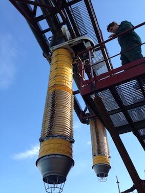 The re-loader tanks in the engine room first are filled and then pressed empty. A vacuum pump first empties Tank One. Then a valve connected to the suction pipe opens, allowing a mixture of cement and air to be drawn into the vessel. The air escapes at the top of the vessel through a dust filter; the cement remains in the vessel as a result of the force of gravity. The amount of cement in the boiler is monitored by a level probe. Once Vessel One is full, the system switches automatically several valves, so that Boiler Two is filled.