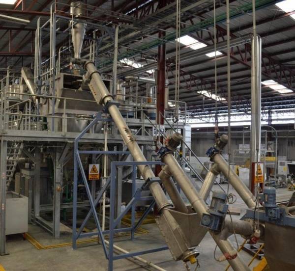 Fig. 2) After sorting, the PET bottles are size reduced in two Herbold granulators with a capacity of 1800 kg/h each.