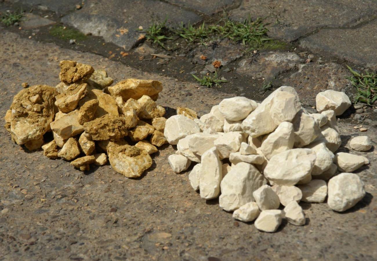 Usually wet washing processes are used, e.g. rock washing plants known from sand and gravel processing, to remove the pollutants adherent to the limestone. Then the washed materials have to be dried before further processing (crushing, screening, classifying, burning). The use of rock washing plants requires an expensive sewage and sludge treatment and, only for this reason, cannot be used unproblematically everywhere. The required capital spending and power for such plants, above all combined with drying, is considerable, also because the washing of the rock leads to the a higher water content exceeding the original rock moisture. It would not be reasonable to operate rock washing plants in regions with heavy frost or arid areas, from the technical and economic point of view.