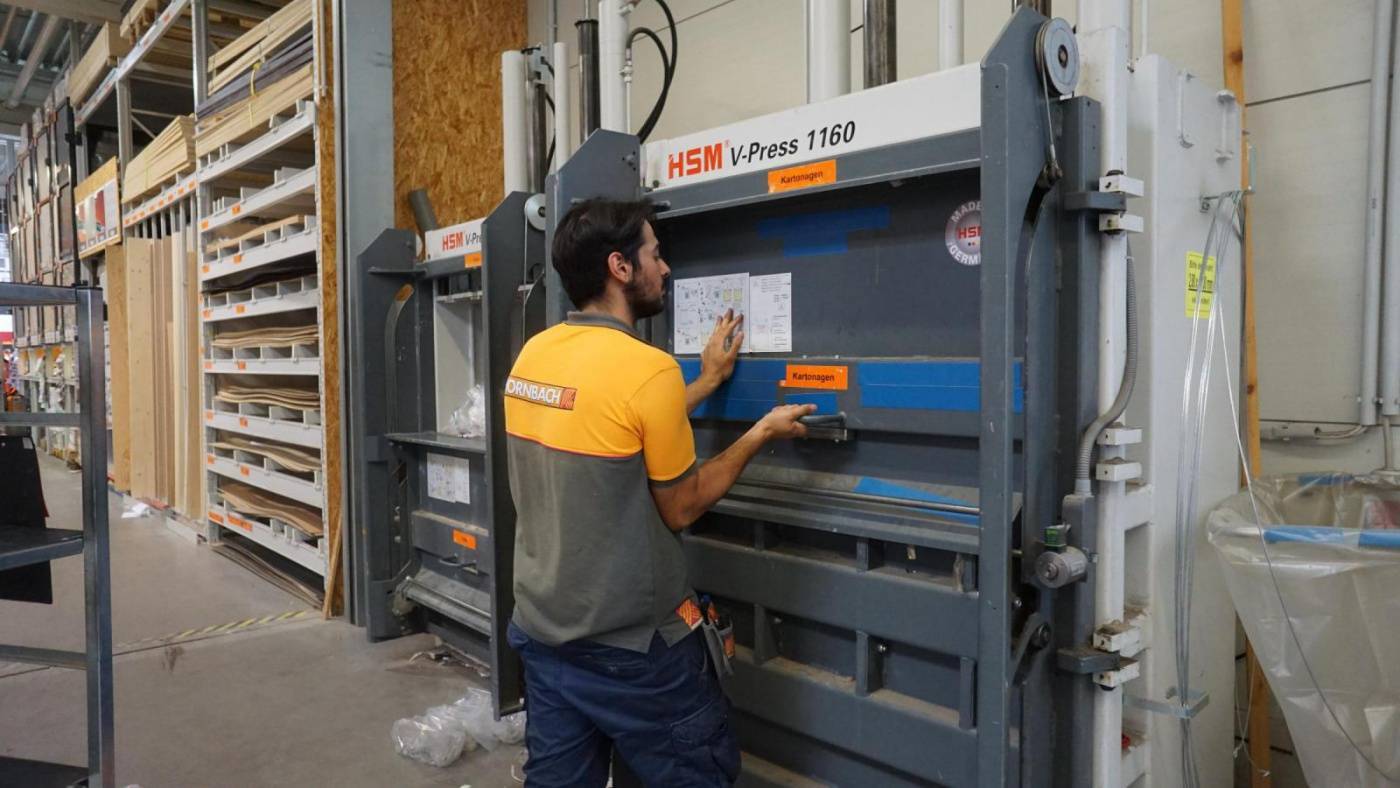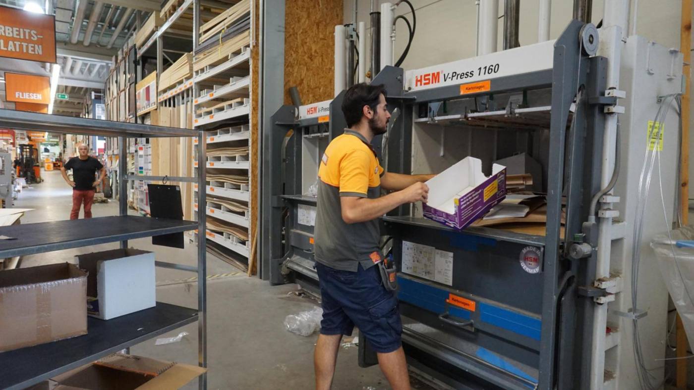 The objective was a waste management concept that foresaw waste separation and a container registry for more transparency. Additionally, the journeys within the incoming goods areas of the DIY megastores and garden centres were to be optimised so that employees could work more effectively. Disposal of the recyclable material was to become independent of a recycling partner. It quickly became apparent to Andreas Back and his colleagues at the Hornbach Headquarters in Bornheim (Palatinate/Germany) that for this concept, compaction machines were required which could press the recyclable material directly into marketable bales, whilst simultaneously taking up as little of the valuable space within the incoming goods area as possible. The machines should have a high pressing power, a long service life and the manufacturer must have a close-knit service network available to them. Andreas Back: “In the event of a repair, we need a solution within 24 hours, anything else would hold up operations and cost too much money.”