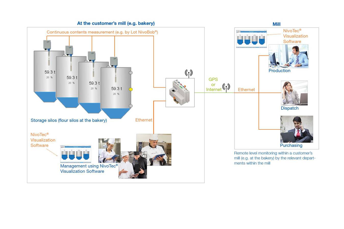 Even bakeries with multiple storage silos often do not have an automated level monitoring system to control their inventory levels. Therefore these stocks have to be checked manually on a regular basis and an order has to be triggered to the flour supplier on time. Due to unforeseen fluctuations in demand or simply by not having verified the stock levels sudden emergencies arise that lead to unplanned extra tours for the mill.