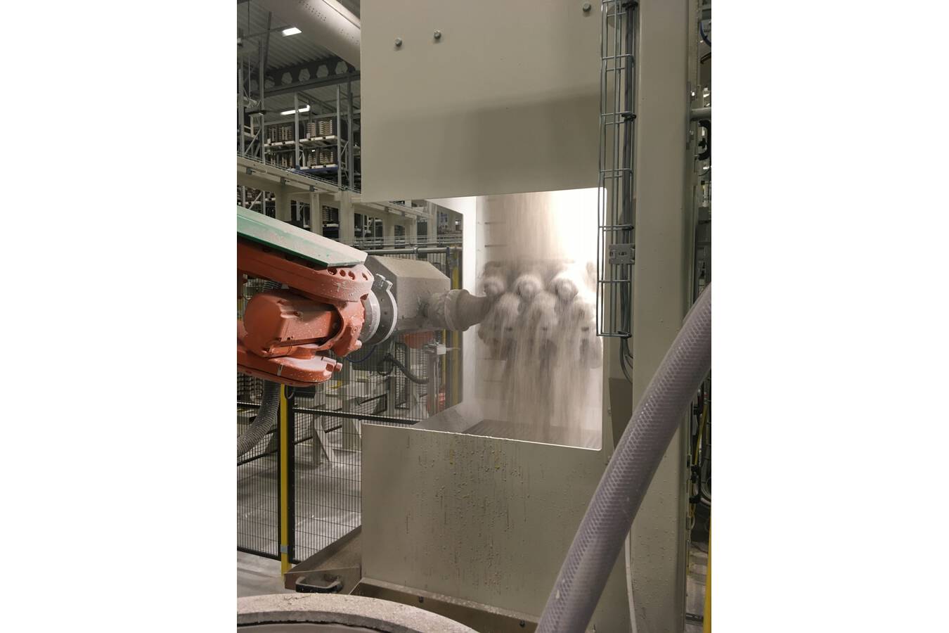 One of the many process steps in the ‘lost wax model’ method is that a ‘wax tree’ -which consists of a series of wax molds-is coated with a ceramic layer, to eventually arrive at a cast result. The wax tree is imersed in a slurry, raised and then dusted with a ceramic powder (a type of sand), followed by a drying process. This is a cycle that repeats itself seven to nine times. Finally a refractory, ceramic mantle is formed around the was moulds. This process step is carried out fully automatically by robots.