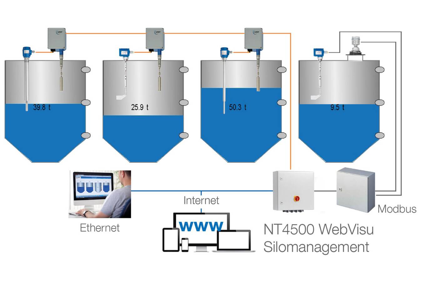 Therefore a level visualization system was connected. Because of the wide range of different level control solutions within the UWT NivoTec® series, it could be found a proper economical model for the plant. The level signals of the installed sensors were bundled by the visualization software combined with a Wago WebController. The information received was passed to the Internet using an Ethernet connection via a routed IP address. The plant could securely access this information (password-protected) via any internet browser at any time of the day over a pre-defined IP address). It is possible to include any number of other silos or tans in the visualization system - without additional hardware or costs. If the priority is to keep installation at the plant silos to a minimum a GSM modem can be used to remotely access the data. In this case for the data transmission no Ethernet connection is required, but only a SIM card in the WAGO to pass the modem. This modem collects all level signals and sends them in an encrypted log via mobile phone over the Internet to the appropriate controller.