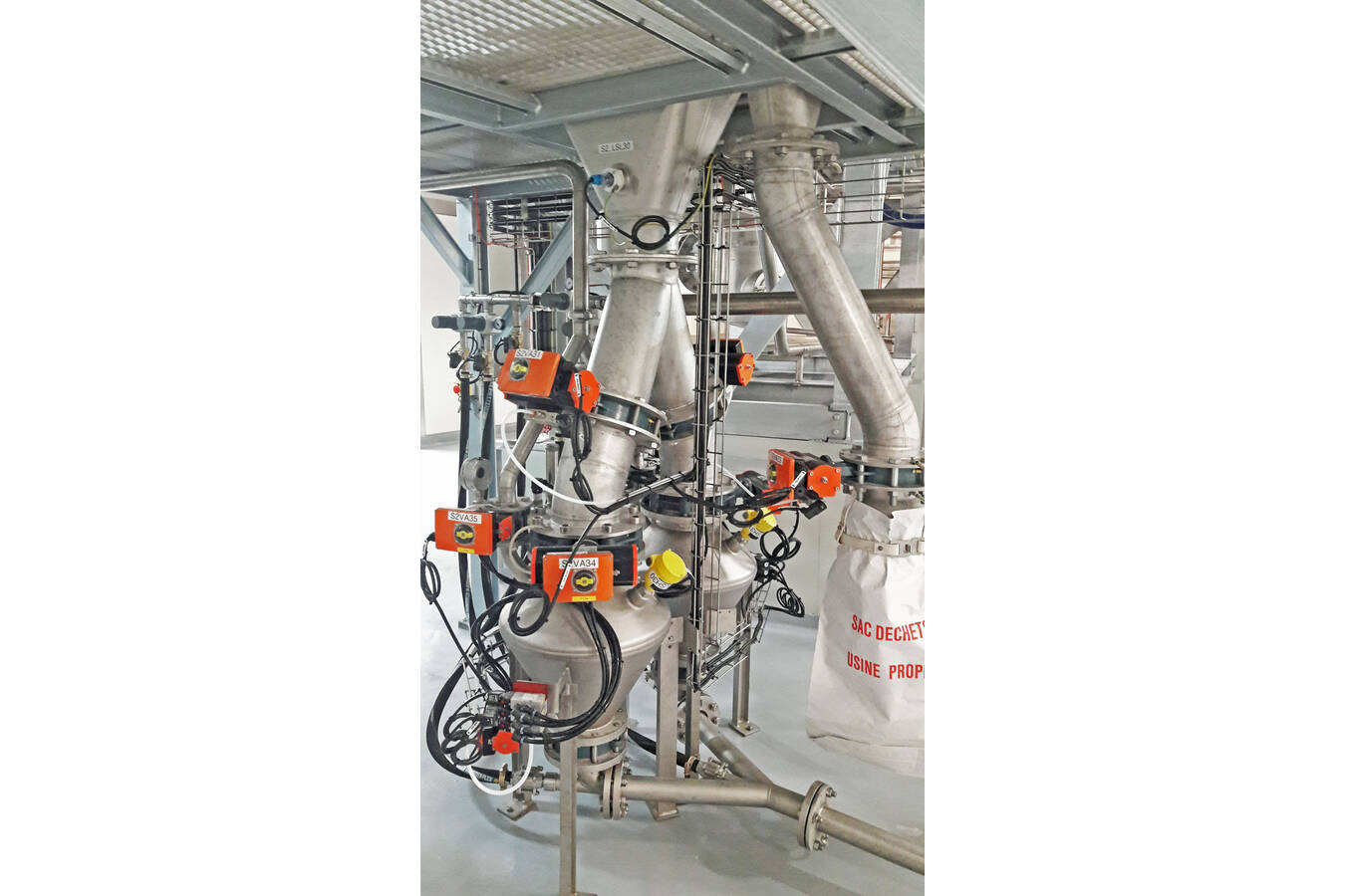 A lean phase pneumatic conveying system with negative or positive pressure would have been possible. However, because the powder must be treated very gently minimising the creation of fines during the transport, a low velocity dense phase conveying system Gericke PulseFlow PTA with two vessels was selected. The two 20 l pressure vessels were placed side by side and successfully fitted below the continuously discharging rotary valve. The chocolate powder is fed at a rate of 1.5 t/h into one pressure vessel while the other vessel is conveying and alternating. This mode generates a continuous product transport.
