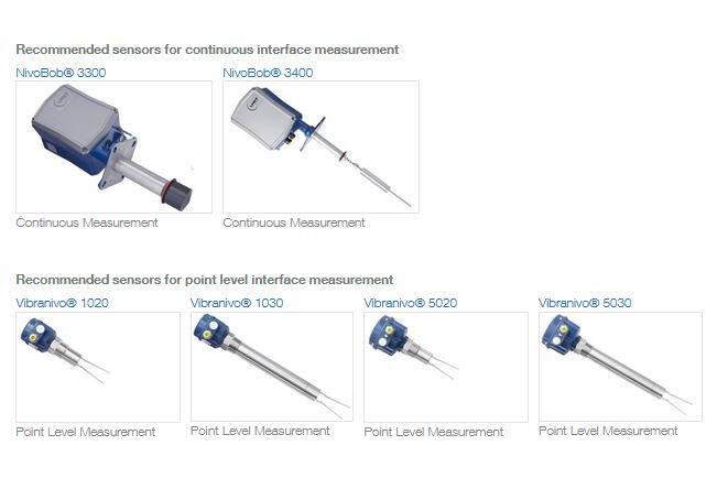 Project planning options for interface detection with electromechanical lot system NivoBob® for continuous level measurement or vibrating fork Vibranivo® for point level detection from UWT GmbH.