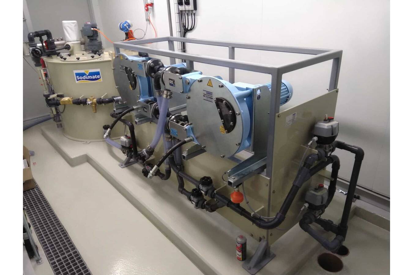 The tanks are made of PPH/PEHD as standard (alternatively also made of steel or stainless steel) and are equipped with an agitator mixer, level sensor indicator, a water dosing panel board and the necessary connections for pumping, emptying, lime milk ring line, etc.