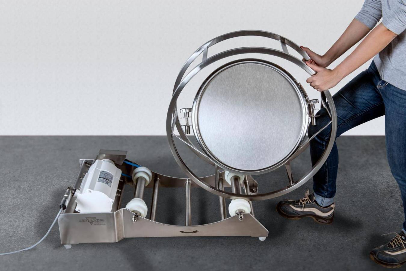 Here, along with making the mixer easy to clean, our top priorities were the avoidance of dead spaces and stopping product residues from accumulating. Therefore, all of the hygienic version's surfaces are especially flat and all internal parts are very easily accessible. As the drum hoop mixer can be completely dismantled, it can also simply be disassembled into its individual components, so that the user can clean and disinfect them thoroughly. In the focus of the reworking of the model was the roller track on which the drum hoop is positioned with its drum mounting and mixing container. Instead of a construction made up of several parts, the new hygienic variation consists of a single component made of welded stainless steel. Thanks to the open design and flat surfaces, it can be cleaned quickly and easily. The roller track is reinforced with cross tubes that, due to their round shape, do not offer any space for product residues or dirt. The drum hoop mixer is driven by an aseptic motor that is perfectly suited for use in hygiene-sensitive industries due to its smooth casing. The drum mounting is covered with a special anti-sliding coating that meets FDA requirements to hold the mixing container securely while the machine is in operation. The cladding is equipped with star knobs made of stainless steel for simple dismantling.