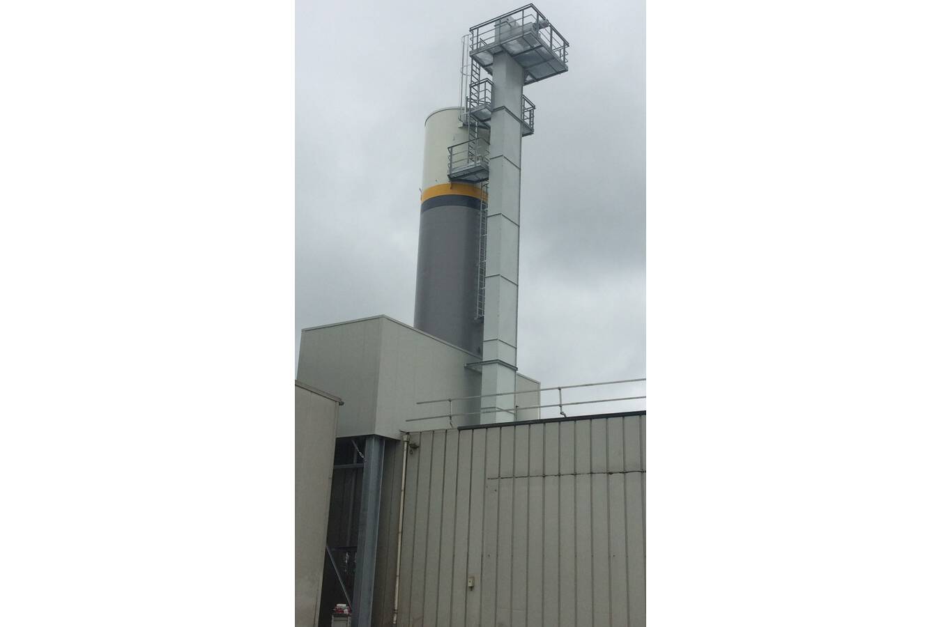 In close collaboration with partner companies, a self-supported steel construction was realized, over the existing roof, on which the silo was placed. In combination with a 3 meter long stainless steel vibrating conveyor equipped with a VibraDrive® (Alvibra) and a bucket elevator (including cleaning bottom), the product is transported into the silo. In addition, the silo is also equipped with blow-in pipes.