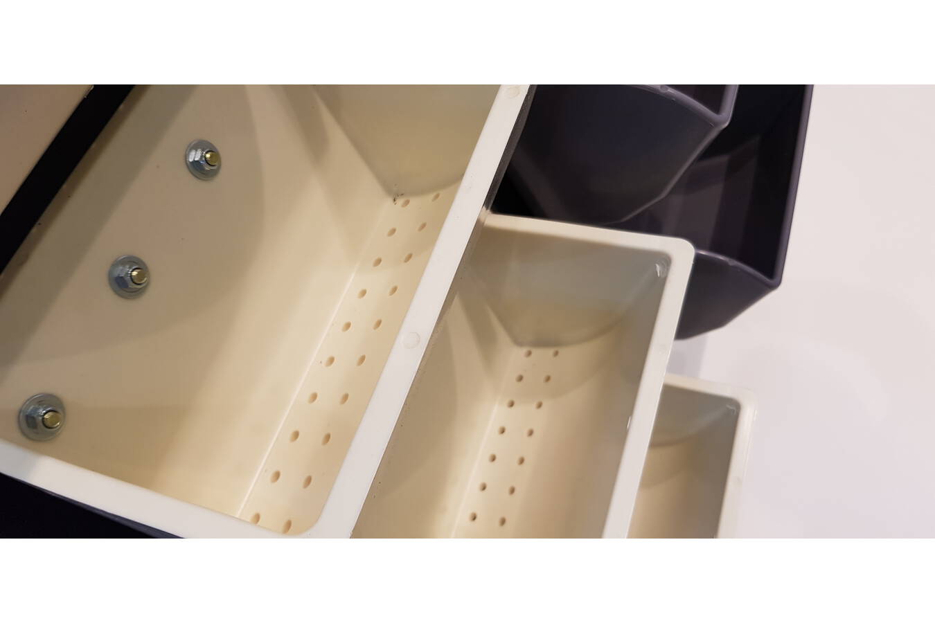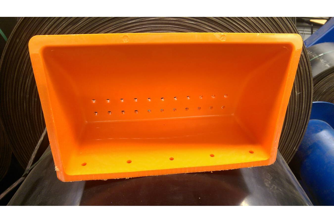Because these materials tend to trap air when being handled by an elevator bucket, it is necessary to provide air relief to assist in their filling and discharge. Materials in this category might be various flours, meals, feed mash or screenings. As these materials enter the bucket, air is released through a series of vent holes in the bottom of the bucket allowing for a more complete fill. These vent holes also allow air to re-enter the bucket, which facilitates full release of product into the discharge. Standard hole diameter is equal to the size of the bolt mounting holes. Anything different is considered a custom vent.
