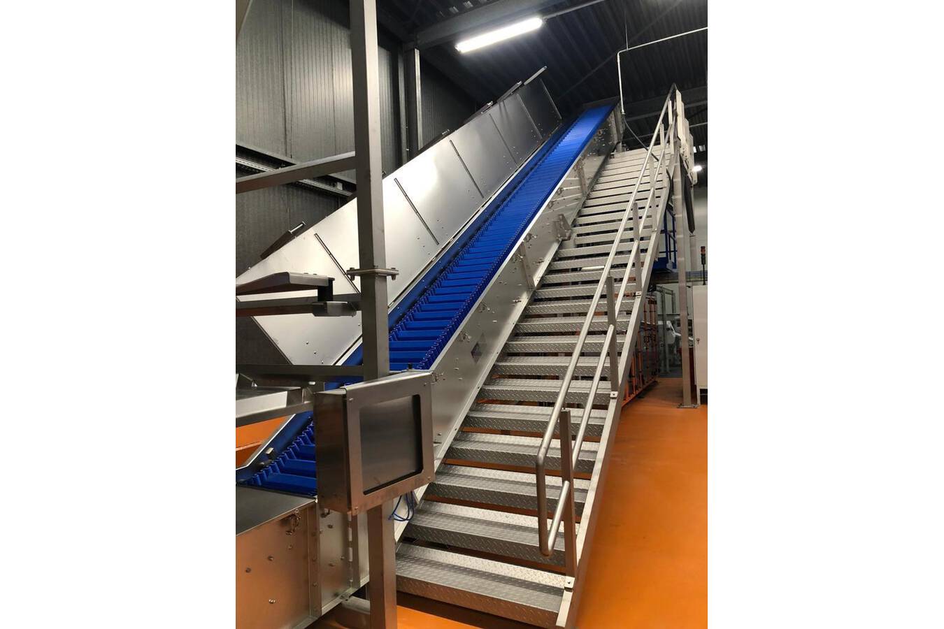 The installation is food-safe in accordance with EC1935-2004 and FDA guidelines. The transport installation has a minimum of seams and can be cleaned quickly and easily. Wet cleaning can be performed if desired. An automatic air knife is also provided so that manual cleaning is kept to a minimum. Manual (wet) cleaning is only carried out in the case of very critical product changes.