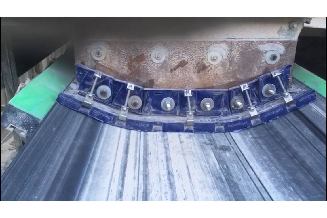 From dust till none: Rich in ideas and low in dust How an innovative skirting performs extremely clean work at conveyor transfer points A typical problem in gypsum and cement production and a real cost factor: At most transfer points, material spillage and dust generation as well as the wear and tear of conventional sealing solutions cause additional work and long-term additional costs. A simple and effective innovation provide an uncomplicated remedy. With the contactless skirting AirScrape®, the developers at ScrapeTec offer a perfect solution that is convincing more and more customers in practice. The company Rump & Salzmann Gipswerk Uehrde GmbH & Co KG with its dolomite quarry in Uehrde has been one of these customers from the very beginning. Scenario: Transfer from rotor crusher to belt. Uwe Schridde, Operations Manager at Rump & Salzmann in Uehrde, describes the situation at the time as follows: "Especially at this transfer point, we had to struggle regularly with problems relating to dust and material loss. There were material spills in the ton range. The spilled material then had to be removed