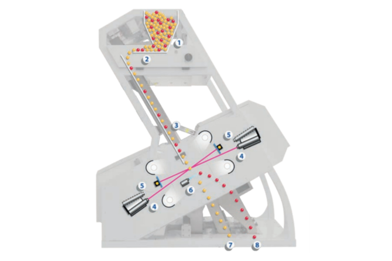 Cameras are used to analyze the colour of each grain of rice individually. With compressed air, each rice grain is then blown into the correct output.