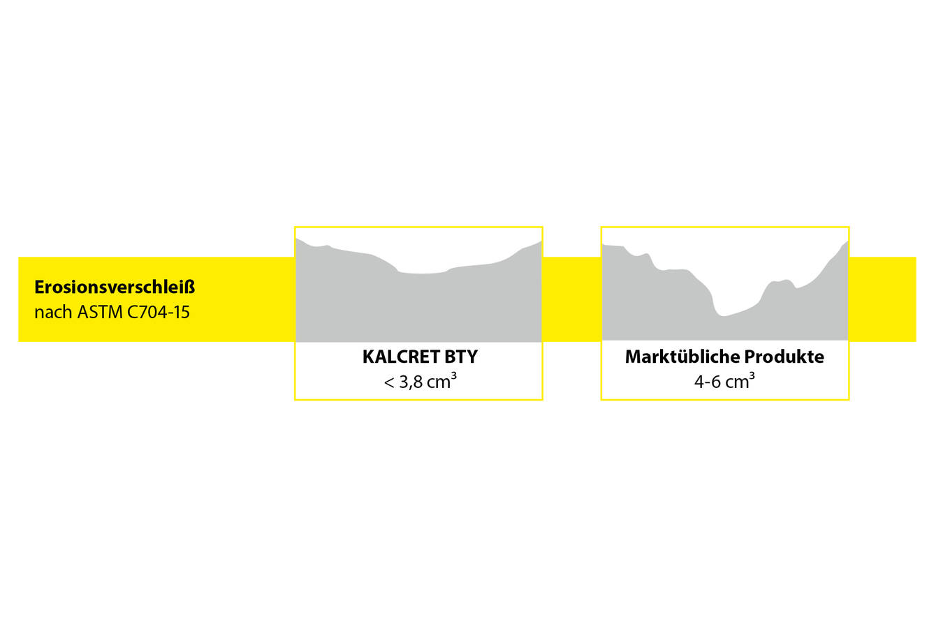 KALCRET complies with strict international erosion resistance wear testing requirements according to ASTM-C704-15 and ASTM G65 as well as abrasion resistance wear testing requirements according to Böhme DIN 52108.