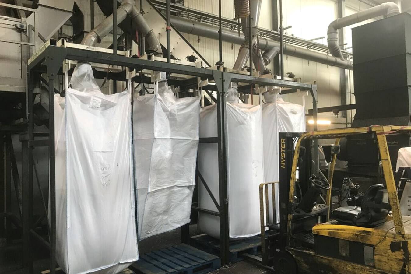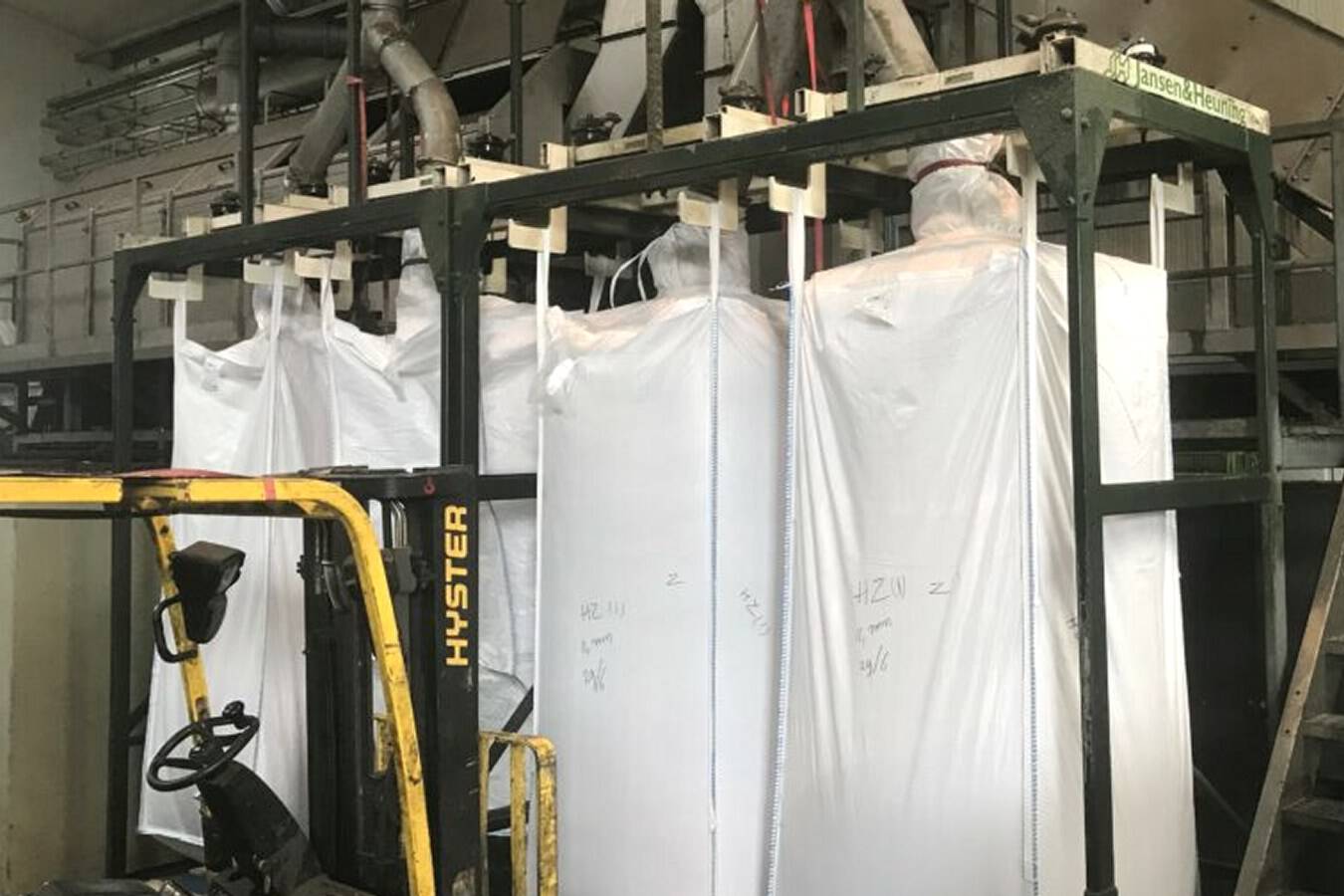 Jansen&Heuning designed a modification of the existing big bag filling stations by adding a big bag shaking system. This filling and shaking station lifts the big bags during the filling process and then drops them back down. This way, the recycling products are constantly being pushed down, allowing more space for more filling.