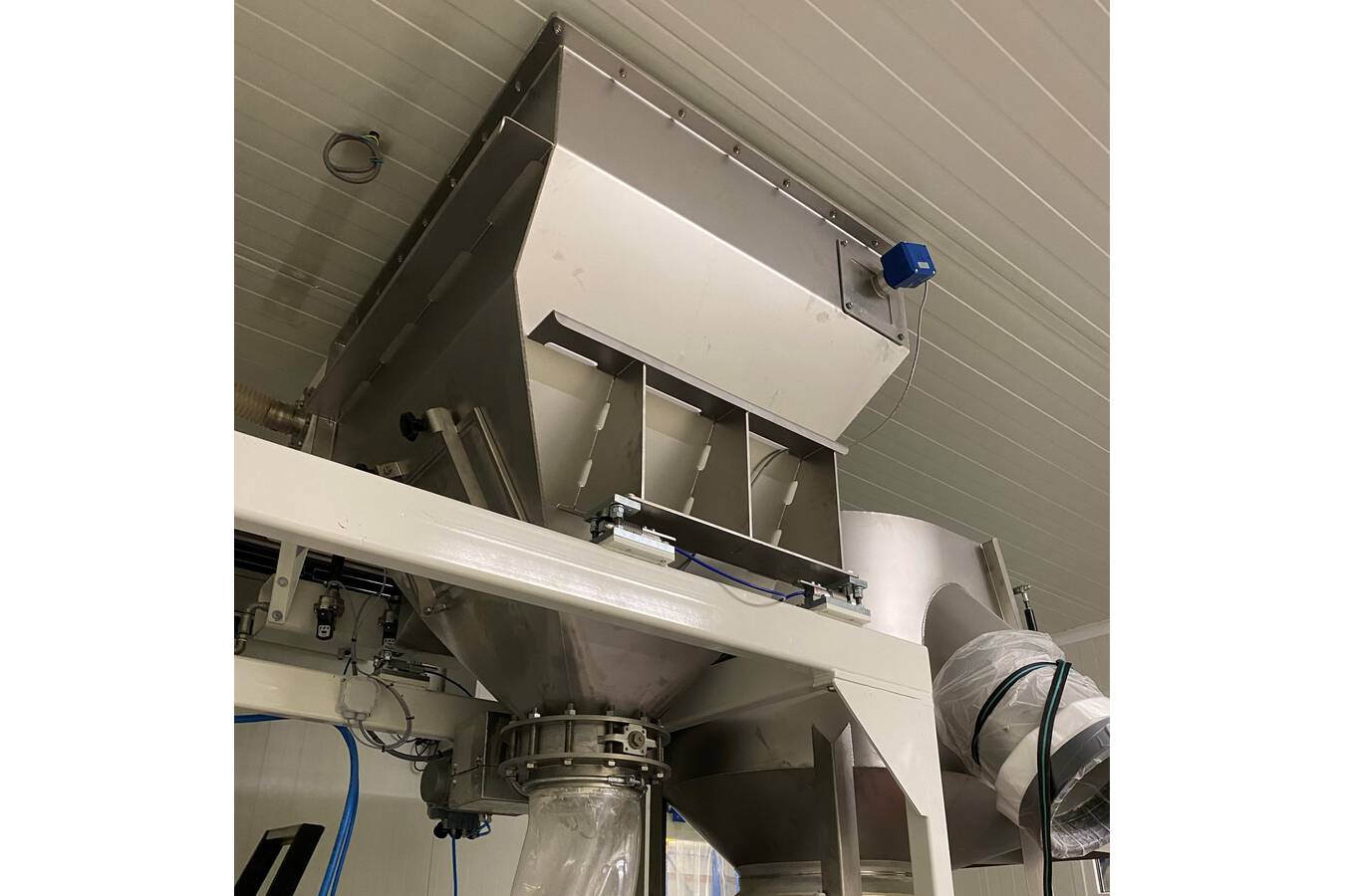 The components are dosed via sanitary dosing valves on a mobile weigher with a bucket with inliner on top. There is a crucial detail at this point, which ensures dust-free connection without affecting weighing.