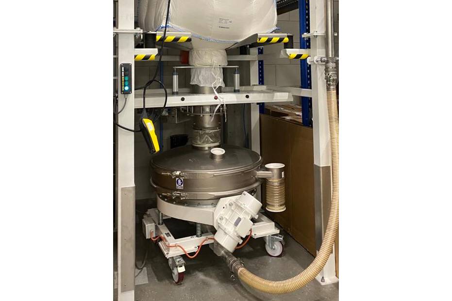 Each mixture consists of a carrier such as wheat flour. This product is delivered in big-bags. Using a sanitary dosing valve, the product is dosed onto a mobile vibrating screen. At the bottom of the sifter, this feeds a pneumatic suction conveyor, which transports the product towards the weighing vacuum separator above the mixer.